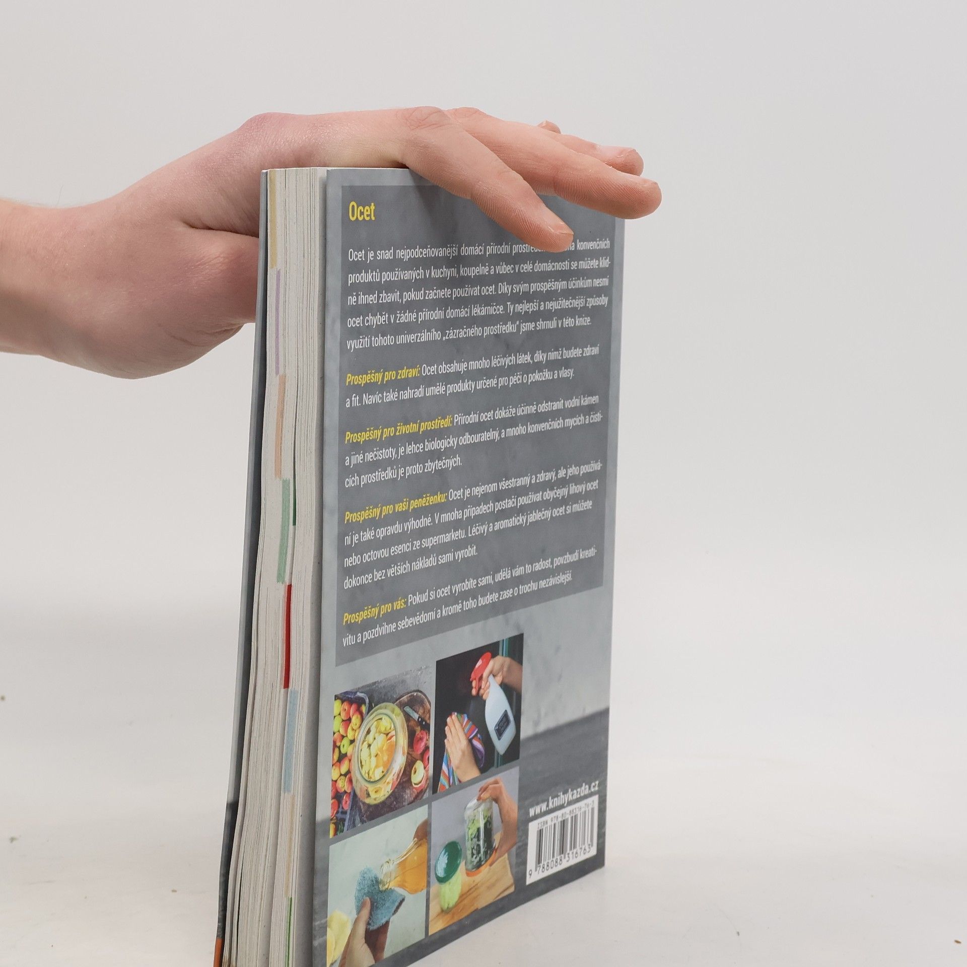 ,,více než 150 způsobů použití pro zdraví, péči o tělo a ekologickou domácnost.. Ocet je snad nejpodceňovanější domácí přírodní prostředek – mnoha konvenčních produktů používaných v kuchyni, koupelně a vůbec v celé domácnosti se můžete klidně ihned zbavit, pokud začnete používat ocet. Díky svým prospěšným účinkům nesmí ocet chybět v žádné přírodní domácí lékárničce. Ty nejlepší a nejužitečnější způsoby využití tohoto univerzálního „zázračného prostředku“ jsme shrnuli v této knize. Prospěšný pro zdraví: Ocet obsahuje mnoho léčivých látek, díky nimž budete zdraví a fit. Navíc také nahradí umělé produkty určené pro péči o pokožku a vlasy. Prospěšný pro životní prostředí: Přírodní ocet dokáže účinně odstranit vodní kámen a jiné nečistoty, je lehce biologicky odbouratelný, a mnoho konvenčních mycích a čisticích prostředků je proto zbytečných. Prospěšný pro vaši peněženku: Ocet je nejenom všestranný a zdravý, ale jeho používání je také opravdu výhodné. V mnoha případech postačí používat obyčejný lihový ocet nebo octovou esenci ze supermarketu. Léčivý a aromatický jablečný ocet si můžete dokonce bez větších nákladů sami vyrobit. Prospěšný pro vás: Pokud si ocet vyrobíte sami, udělá vám to radost, povzbudí kreativitu a pozdvihne sebevědomí a kromě toho budete zase o trochu nezávislejší.