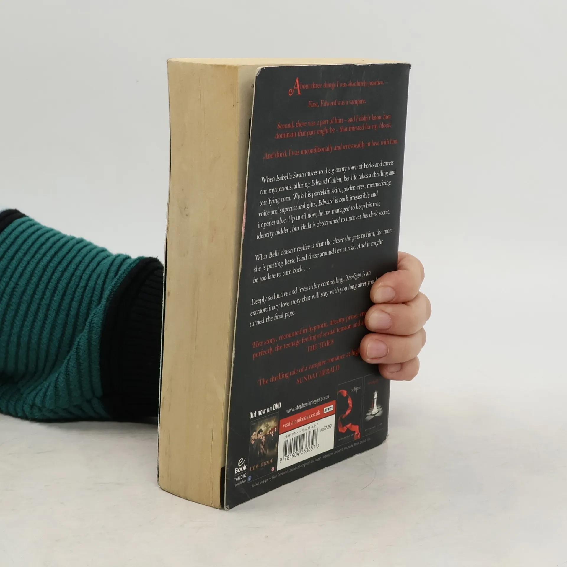 When Isabella Swan moves to the gloomy town of Forks and meets the mysterious, alluring Edward Cullen, her life takes a thrilling and terrifying turn. With his porcelain skin, golden eyes, mesmerizing voice, and supernatural gifts, Edward is both irresistible and impenetrable. Up until now, he has managed to keep his true identity hidden, but Bella is determined to uncover his dark secret. What Bella doesn't realize is that the closer she gets to him, the more she is putting herself and those around her at risk. And it might be too late to turn back ... --back cover