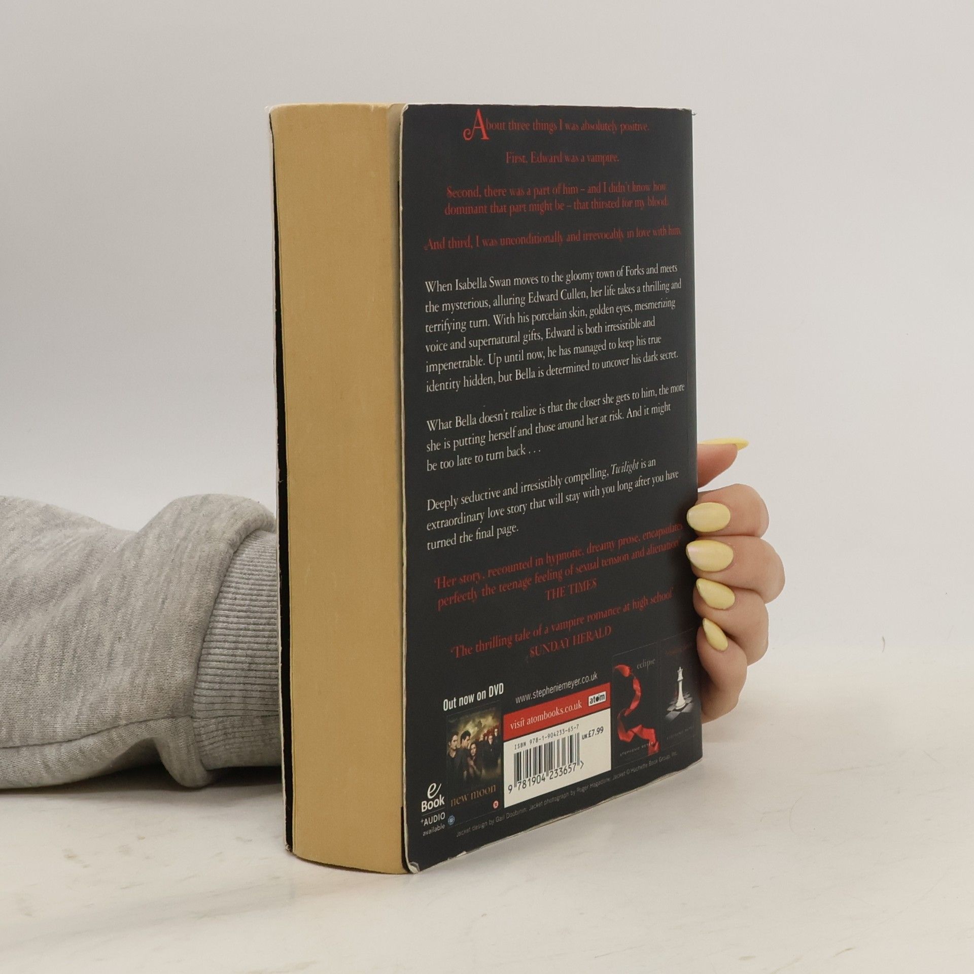 When Isabella Swan moves to the gloomy town of Forks and meets the mysterious, alluring Edward Cullen, her life takes a thrilling and terrifying turn. With his porcelain skin, golden eyes, mesmerizing voice, and supernatural gifts, Edward is both irresistible and impenetrable. Up until now, he has managed to keep his true identity hidden, but Bella is determined to uncover his dark secret. What Bella doesn't realize is that the closer she gets to him, the more she is putting herself and those around her at risk. And it might be too late to turn back ... --back cover