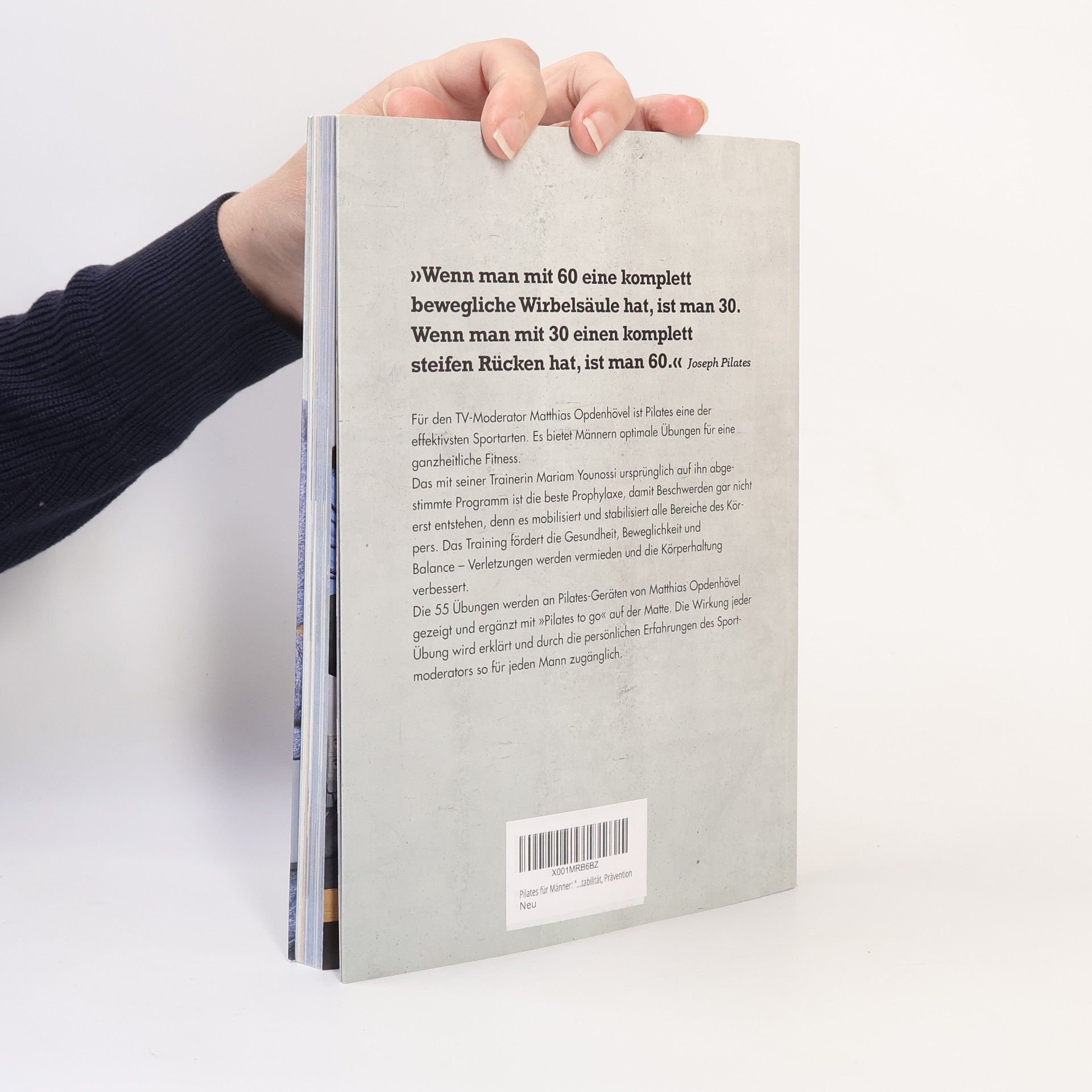 Pilates-Fitness für Männer - bestechend einfach und extrem effektiv. Der TV-Moderator Matthias Opdenhövel präsentiert zusammen mit seiner Trainerin Mariam Younossi das Pilates-Übungsbuch für Männer. Für Matthias Opdenhövel ist Pilates eine der effektivsten Sportarten. Es bietet Männern optimale Übungen für eine ganzheitliche Fitness. „Jeder Mann sollte Pilates machen! Denn das ist kein Pillepalle, sondern das beste Ganzkörper-Training, das ich kenne.“Das mit seiner Trainerin Mariam Younossi ursprünglich auf ihn abgestimmte Programm ist nicht nur die beste Prophylaxe, damit Beschwerden erst gar nicht entstehen, sondern mobilisiert und stabilisiert optimal alle Bereiche des Körpers. Das Training fördert die Gesundheit, Beweglichkeit und Balance, Verletzungen werden vermieden, die Haltung verbessert und man entwickelt eine ganz natürliche Ausstrahlung. Die 52 Übungen werden an Pilates-Geräten von Matthias Opdenhövel gezeigt und ergänzt mit „Pilates to go“ auf der Matte. Die Wirkung jeder Übung wird erklärt und durch die persönlichen Erfahrungen des Sport-Moderators für jeden Mann zugänglich.