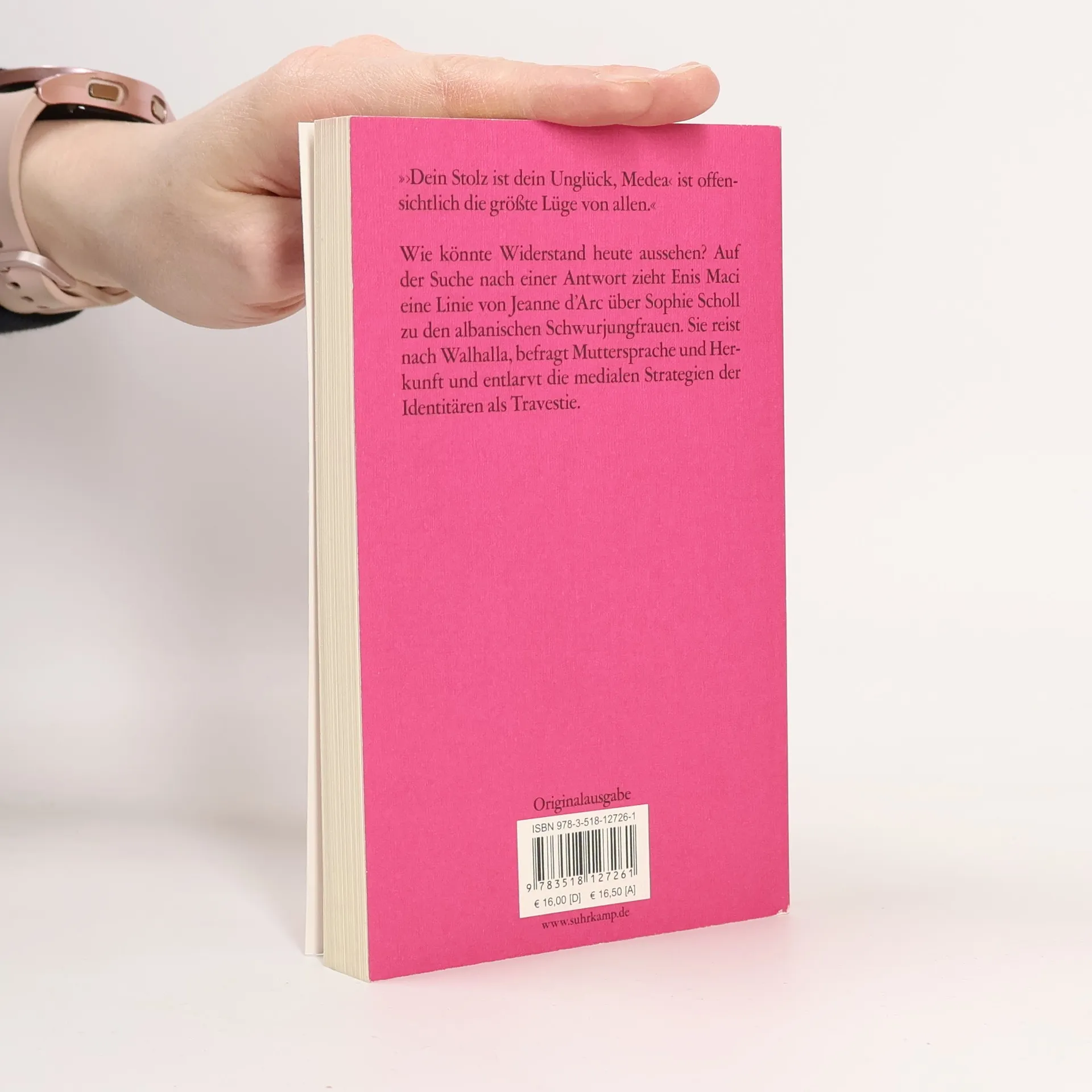 Wie könnte Widerstand heute aussehen? Auf der Suche nach einer Antwort zieht Enis Maci eine Linie von Jeanne D'Arc über Sophie Scholl zu den albanischen Schwurjungfrauen. Sie entlarvt die medialen Strategien der Identitären als Travestie, befragt Muttersprache und Herkunft, reist nach Walhalla und blickt dort auf die Büste der in Auschwitz ermordeten Nonne Edith Stein. Sie verweilt in den sozialen Randzonen und verwebt die losen Zipfel erzählens-notwendiger Dinge zu einem dichten Panorama europäischer Gegenwart. Das Außerordentliche überkreuzt sich in ihren Essays mit dem Alltäglichen, das Private mit dem Politischen.