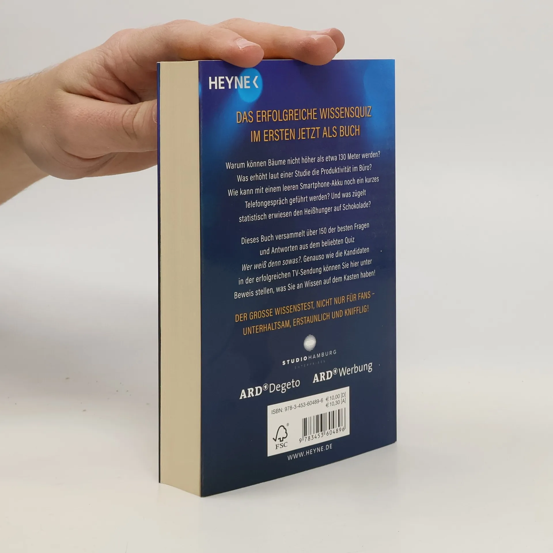 Das erfolgreiche Wissensquiz im Ersten jetzt als Buch Warum können Bäume nicht höher als etwa 130 Meter werden? Was erhöht laut einer Studie die Produktivität im Büro? Wie kann mit einem leeren Smartphone-Akku noch ein kurzes Telefongespräch geführt werden? Und was zügelt statistisch erwiesen den Heißhunger auf Schokolade? Dieses Buch versammelt über 150 der besten Fragen und Antworten aus dem beliebten Quiz Wer weiß denn sowas? (ARD). Genauso wie die Kandidaten in der erfolgreichen TV-Sendung können Sie hier unter Beweis stellen, was Sie an Wissen auf dem Kasten haben! Der große Wissenstest, nicht nur für Fans – unterhaltsam, erstaunlich und knifflig!