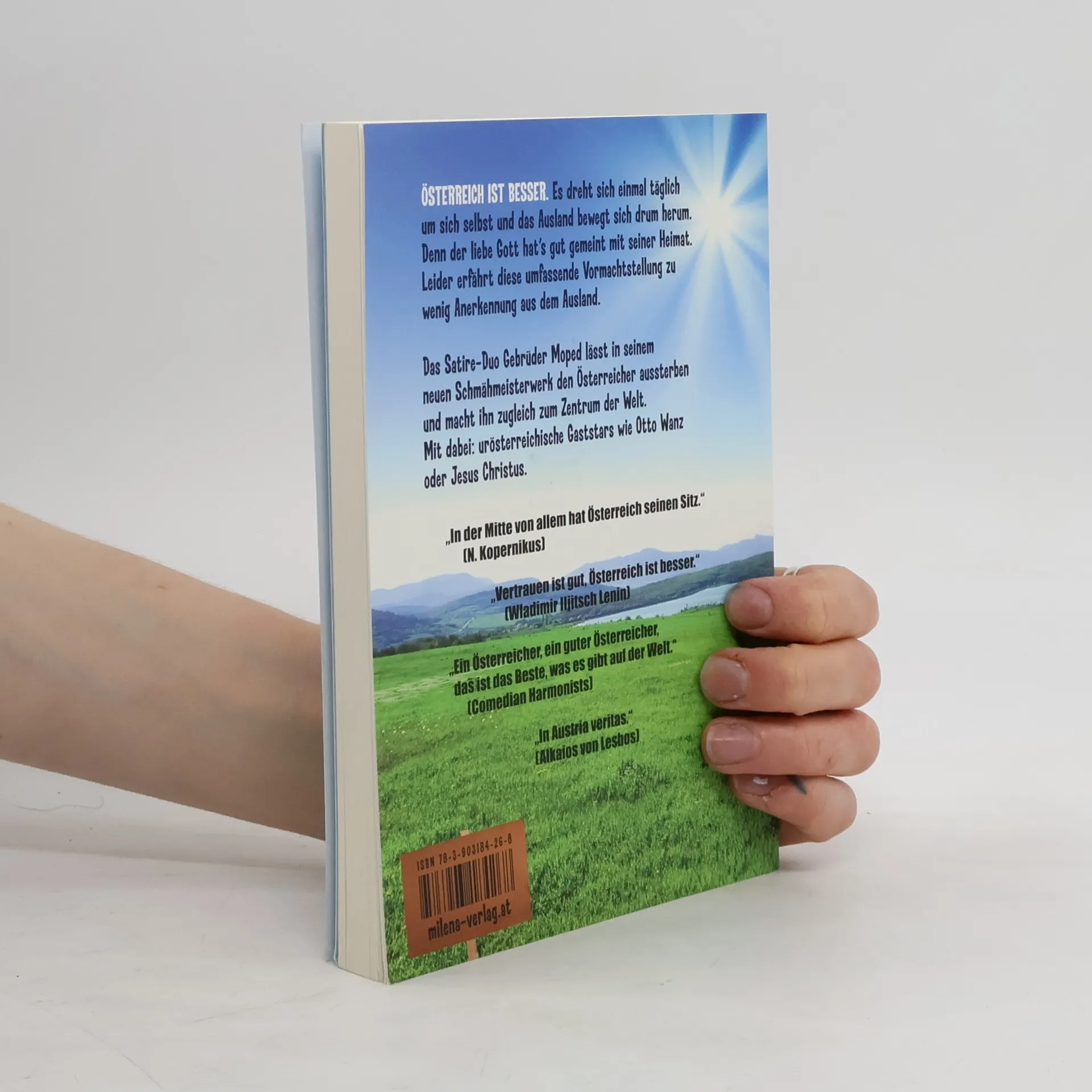 Endlich legen die Mopeds, Autoren für Willkommen Österreich, Kolumnisten, Kuratoren und Kabarettisten, bekannt aus Facebook und Fernsehen, sämtliche Belege auf den Tisch: Österreich ist besser. Es dreht sich einmal täglich um sich selbst, und das Ausland bewegt sich drum herum. Denn der liebe Gott hat’s gut gemeint mit seiner Heimat. Leider erfährt diese umfassende Vormachtstellung zu wenig Anerkennung aus dem Ausland. Doch da können die dauerempörten Falterfahrradfahrerinnen noch so vehement dagegentreten: Österreich war an der Schöpfung nicht beteiligt. Wir waren das erste Opfer. „In der Mitte von allem hat Österreich seinen Sitz.“ (Nikolaus Kopernikus) „Vertrauen ist gut, Österreich ist besser.“ (Wladimir Iljitsch Lenin) „It’s the end of Austria as we know it.“ (R. E. M.) „Ein Österreicher, ein guter Österreicher, das ist das Beste, was es gibt auf der Welt.“ (Comedian Harmonists) „In austria veritas.“ (Alkaios von Lesbos)