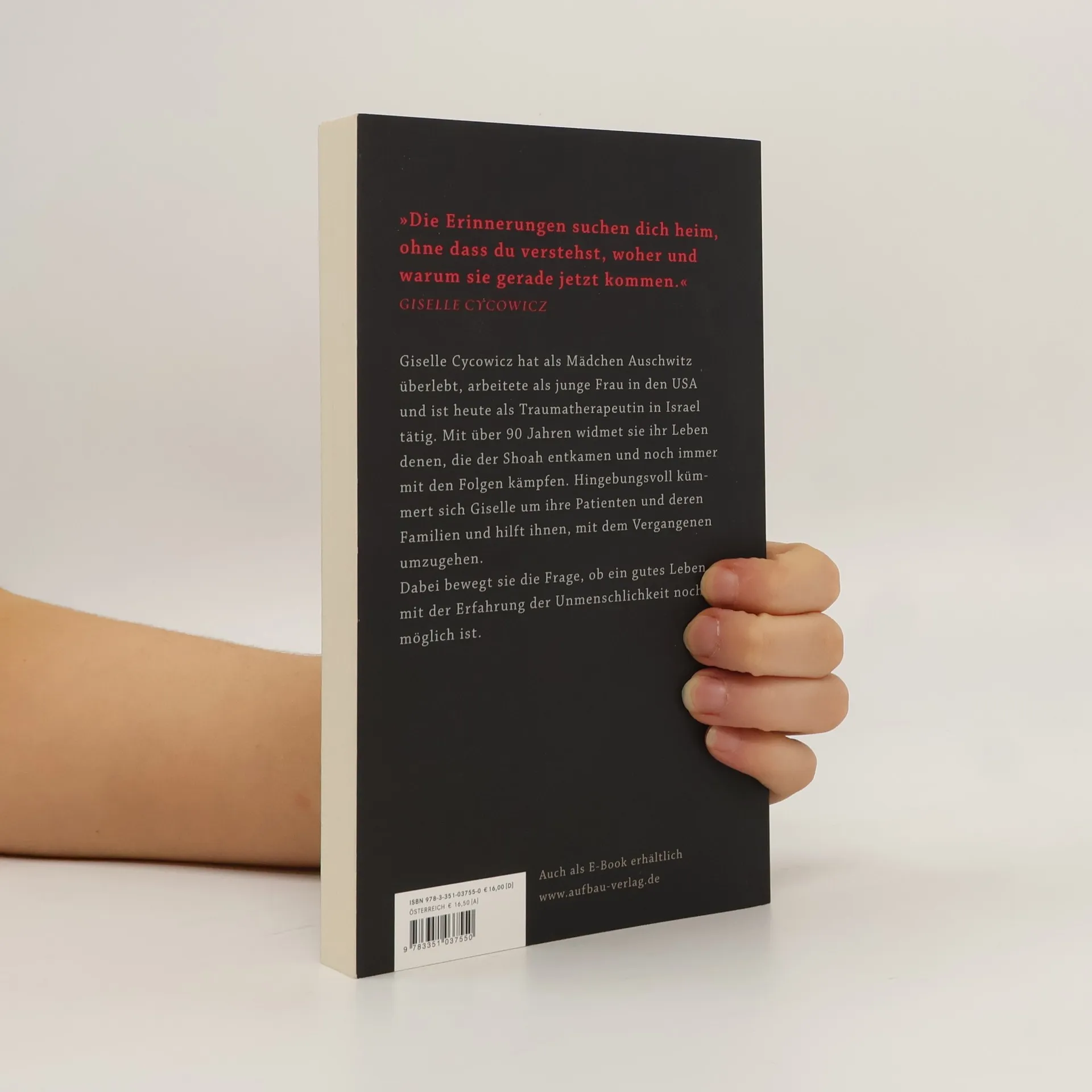 Die faszinierende Geschichte einer Frau, die ihr Leben denen widmet, die der Shoah entkamen: Als junges Mädchen las Giselle „Die Heilung durch den Geist“ von Stefan Zweig. Sie war elektrisiert und wollte eines Tages bei Patienten Traumata zutage fördern, um sie zu heilen. Doch die Nazis deportierten sie samt ihrer Familie 1944 in das Vernichtungslager Auschwitz. Sie überlebte, floh in die USA und baute sich ein neues Leben auf. Erst im Alter von 44 Jahren verwirklichte sie ihren Plan und studierte Psychologie. Mit über 90 praktiziert sie noch immer und kümmert sich als Traumatherapeutin um Holocaust-Überlebende und ihre Nachkommen in Israel. Sabine Adler beschreibt die bewegende Geschichte dieser faszinierenden Frau und die ihrer Patientinnen auf eindrucksvolle Weise.