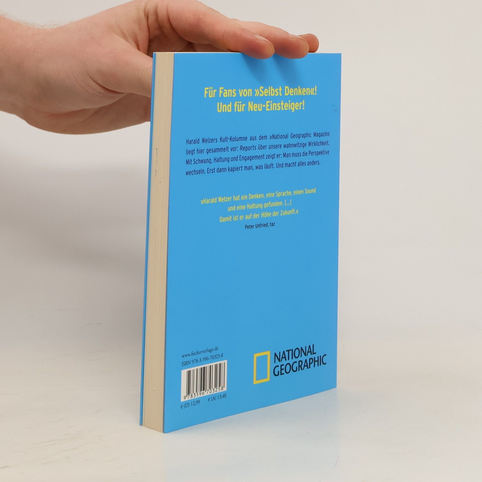 Selbst denken für Einsteiger Monatlich wundert sich Harald Welzer in der deutschen Ausgabe des »National Geographic Magazins«: über unsere Innenstädte, die immer gleich aussehen, über Gänsebraten in der Südsee, die Effizienzfalle, Smartphones und deren Nutzer, über Gipfeltreffen, piepende Bagger, Alt-Ökos, Sofortismus, Hyperkonsum und was ihm sonst noch auffällt. Immer prägnant, immer witzig, immer politisch. Diese Kolumnen liegen nun gesammelt vor, für Fans, Einsteiger und alle, die sich beim Selbstdenken Anregungen verschaffen möchten.