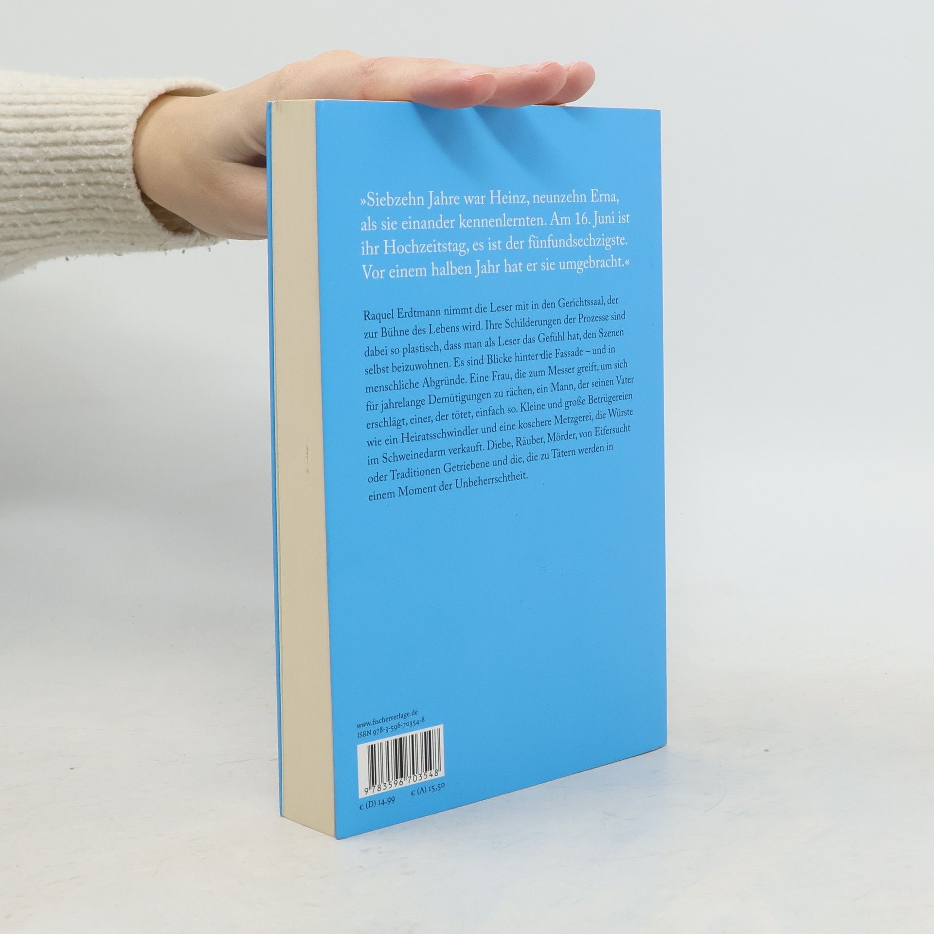 Wahre Verbrechen. Wahre Geschichten. Raquel Erdtmann nimmt die Leser mit in den Gerichtssaal, der zur Bühne des Lebens wird. Ihre Schilderungen der Prozesse sind dabei so plastisch, dass man als Leser das Gefühl hat, den Szenen selbst beizuwohnen. Es sind Blicke hinter die Fassade und in menschliche Abgründe. Eine Frau, die zum Messer greift, um sich für jahrelange Demütigungen zu rächen. Ein Mann, der seinen Vater erschlägt. Einer, der tötet, einfach so. Kleine und größere Betrügereien wie ein Heiratsschwindler oder eine koschere Metzgerei, die Würste im Schweinedarm verkauft. Diebe, Räuber, Mörder, von Eifersucht oder Traditionen Getriebene und die, die zu Tätern werden in einem kurzen Moment der Unbeherrschtheit.