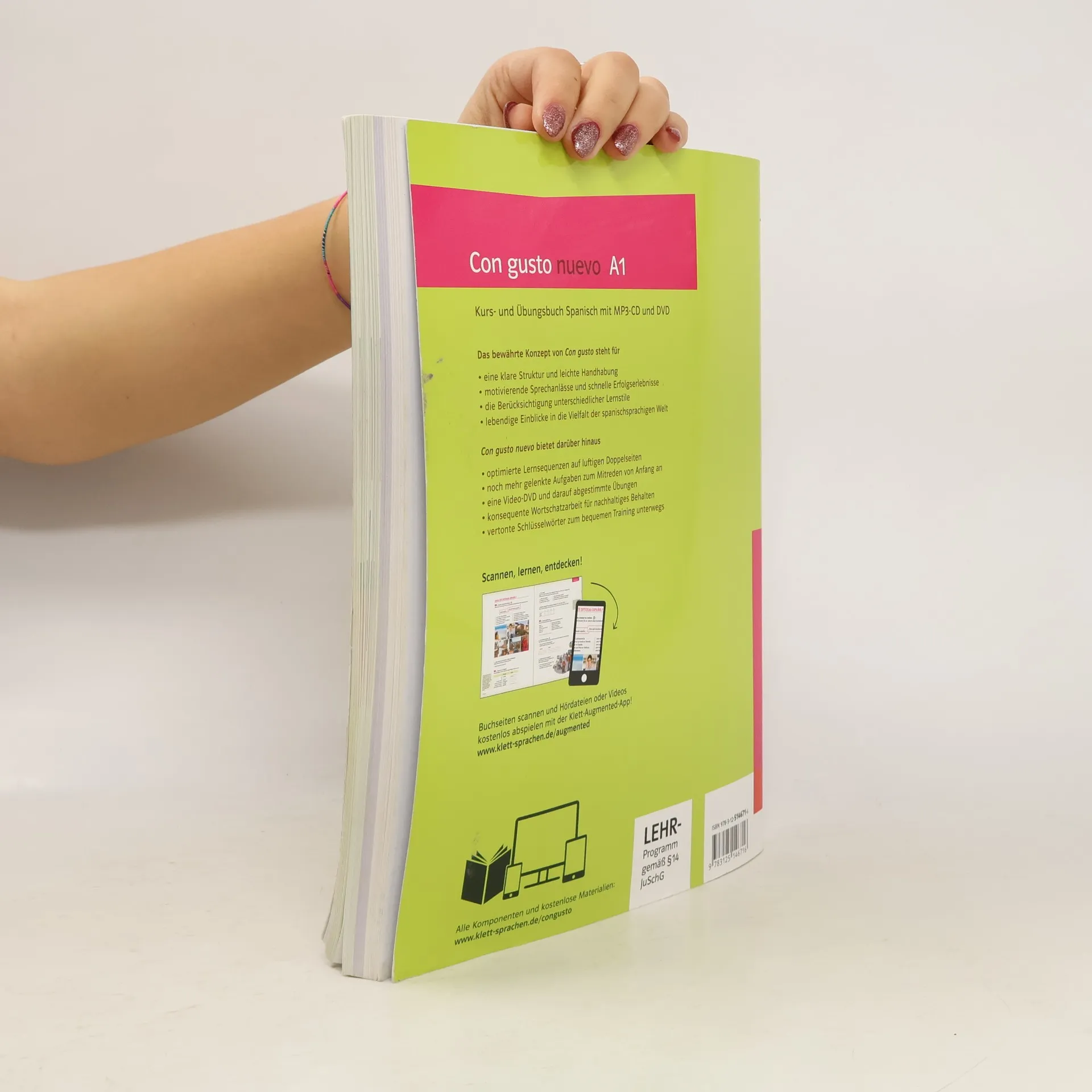 Con gusto nuevo - die Nummer 1 mit verbesserter Rezeptur! Die Neubearbeitung Con gusto nuevo bewahrt die Qualitäten seines Vorgängers: vom transparenten Lektionsaufbau über die motivierenden Sprechanlässe bis zum Eintauchen in die spanischsprachige Welt – das alles in Verbindung mit einer behutsamen Reduzierung der Stoffmenge und noch mehr praktischem Training. Freuen Sie sich auf: - Optimierte Lernsequenzen auf luftigeren Doppelseiten - Verstärkte Wortschatzarbeit - Charmante Videosequenzen mit Untertitel-Option (online) - Transparenter Lektionsaufbau - Motivierende Sprechanlässe von Anfang an - Eintauchen in die spanischsprachige Welt