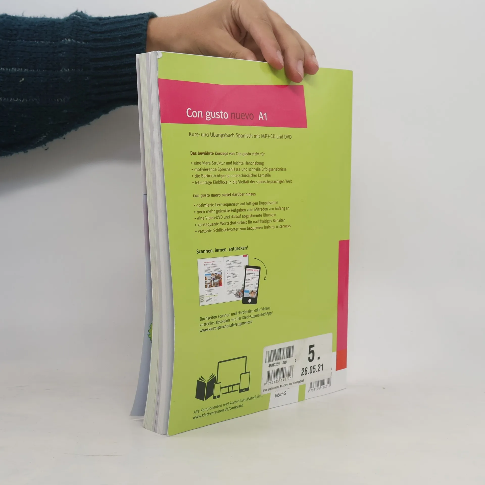 Con gusto nuevo - die Nummer 1 mit verbesserter Rezeptur! Die Neubearbeitung Con gusto nuevo bewahrt die Qualitäten seines Vorgängers: vom transparenten Lektionsaufbau über die motivierenden Sprechanlässe bis zum Eintauchen in die spanischsprachige Welt – das alles in Verbindung mit einer behutsamen Reduzierung der Stoffmenge und noch mehr praktischem Training. Freuen Sie sich auf: - Optimierte Lernsequenzen auf luftigeren Doppelseiten - Verstärkte Wortschatzarbeit - Charmante Videosequenzen mit Untertitel-Option (online) - Transparenter Lektionsaufbau - Motivierende Sprechanlässe von Anfang an - Eintauchen in die spanischsprachige Welt