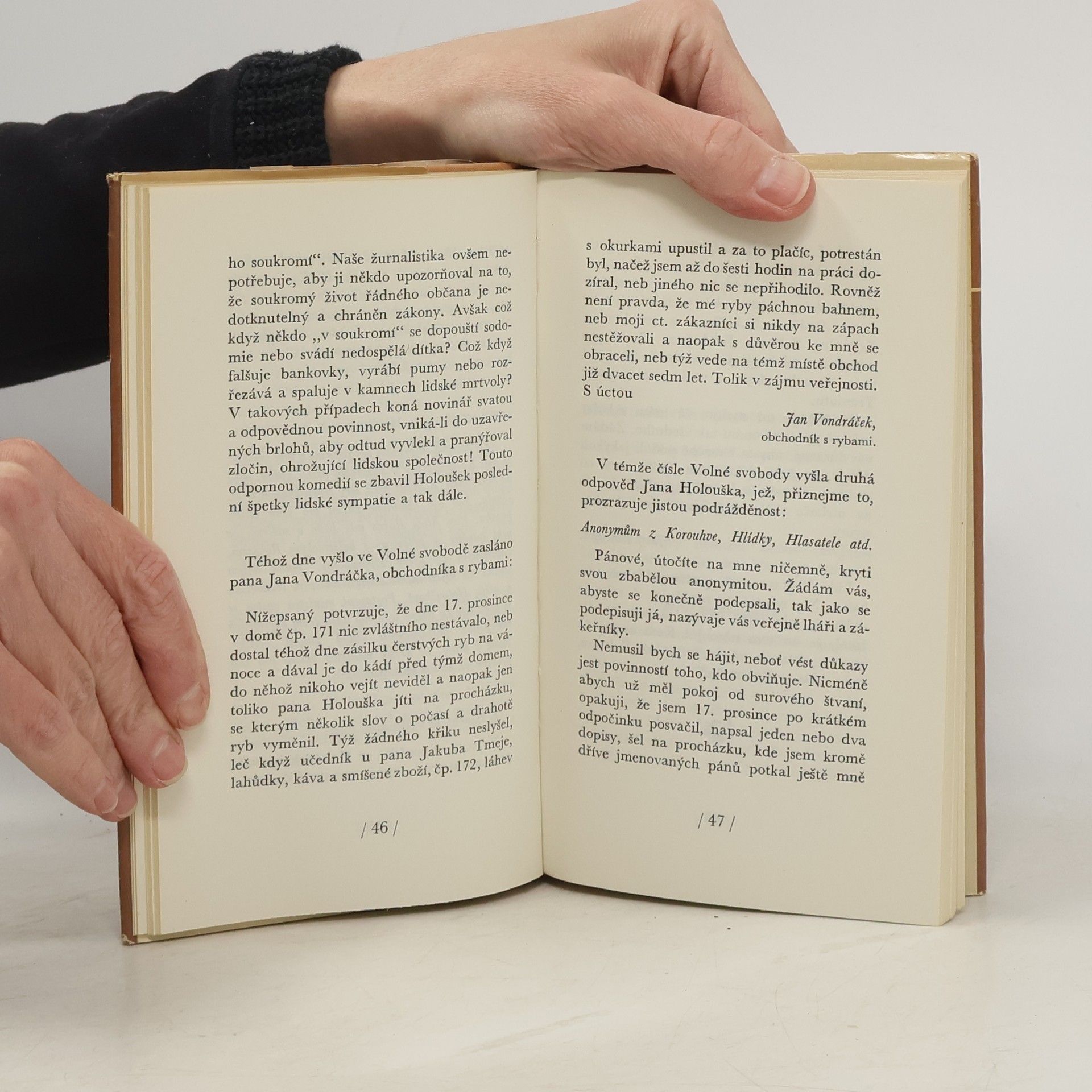 Dvě satirické povídky. Skandální aféra Josefa Holouška - satirická novela líčí, jak noviny rozpoutaly pomlouvačnou kampaň proti naprosto nevinné osobě. Hrdina se nemůže bránit, zbývá mu jen čekat až aféra utichne.