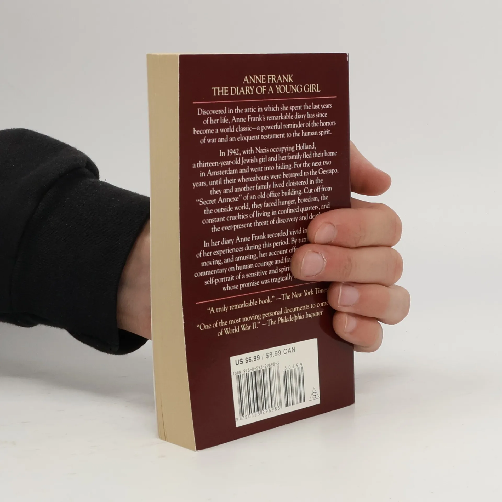 Discovered in the attic in which she spent the last years of her life, Anne Frank’s remarkable diary has become a world classic—a powerful reminder of the horrors of war and an eloquent testament to the human spirit. In 1942, with the Nazis occupying Holland, a thirteen-year-old Jewish girl and her family fled their home in Amsterdam and went into hiding. For the next two years, until their whereabouts were betrayed to the Gestapo, the Franks and another family lived cloistered in the “Secret Annexe” of an old office building. Cut off from the outside world, they faced hunger, boredom, the constant cruelties of living in confined quarters, and the ever-present threat of discovery and death. In her diary Anne Frank recorded vivid impressions of her experiences during this period. By turns thoughtful, moving, and surprisingly humorous, her account offers a fascinating commentary on human courage and frailty and a compelling self-portrait of a sensitive and spirited young woman whose promise was tragically cut short. --back cover