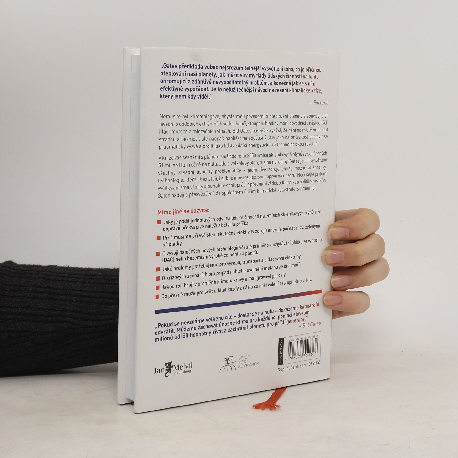 Bill Gates, multimilionář a filantrop, přináší unikátní pohled na prevenci klimatické katastrofy, i když není klimatologem. S dlouholetými investicemi do výzkumu zaměřeného na redukci skleníkových plynů a osobními setkáními s předními vědci a politiky, nabízí důkladně podloženou tezi: pro ochranu přírody a života na Zemi nestačí pouze zastavit nárůst emisí, ale je nutné je dostat na nulu. Ačkoli se to může zdát nereálné, Gates věří, že to dokážeme. Uvědomuje si limity vědeckého poznání, ale objasňuje hlavní mechanismy klimatické změny a podíl různých aspektů lidské činnosti, jako je doprava, zemědělství a stavebnictví. Pouhé šetření nestačí, protože ani pandemie covidu-19 nedokázala emise snížit o více než 5 %. Gates se zaměřuje na aktuální technologické výzkumy, od alternativních zdrojů energie po metody zachycování emisí. Nabízí návod, jak se k této výzvě postavit na osobní i politické úrovni a jak o ní diskutovat. Nevyhýbá se ani otázce své vlastní uhlíkové stopy a vysvětluje, jak se ji snaží odčinit. Kniha je určena nejen těm, kdo trpí enviromentální úzkostí, ale všem, kteří chtějí transformovat svůj život a podnikání, aby zabránili klimatické katastrofě.