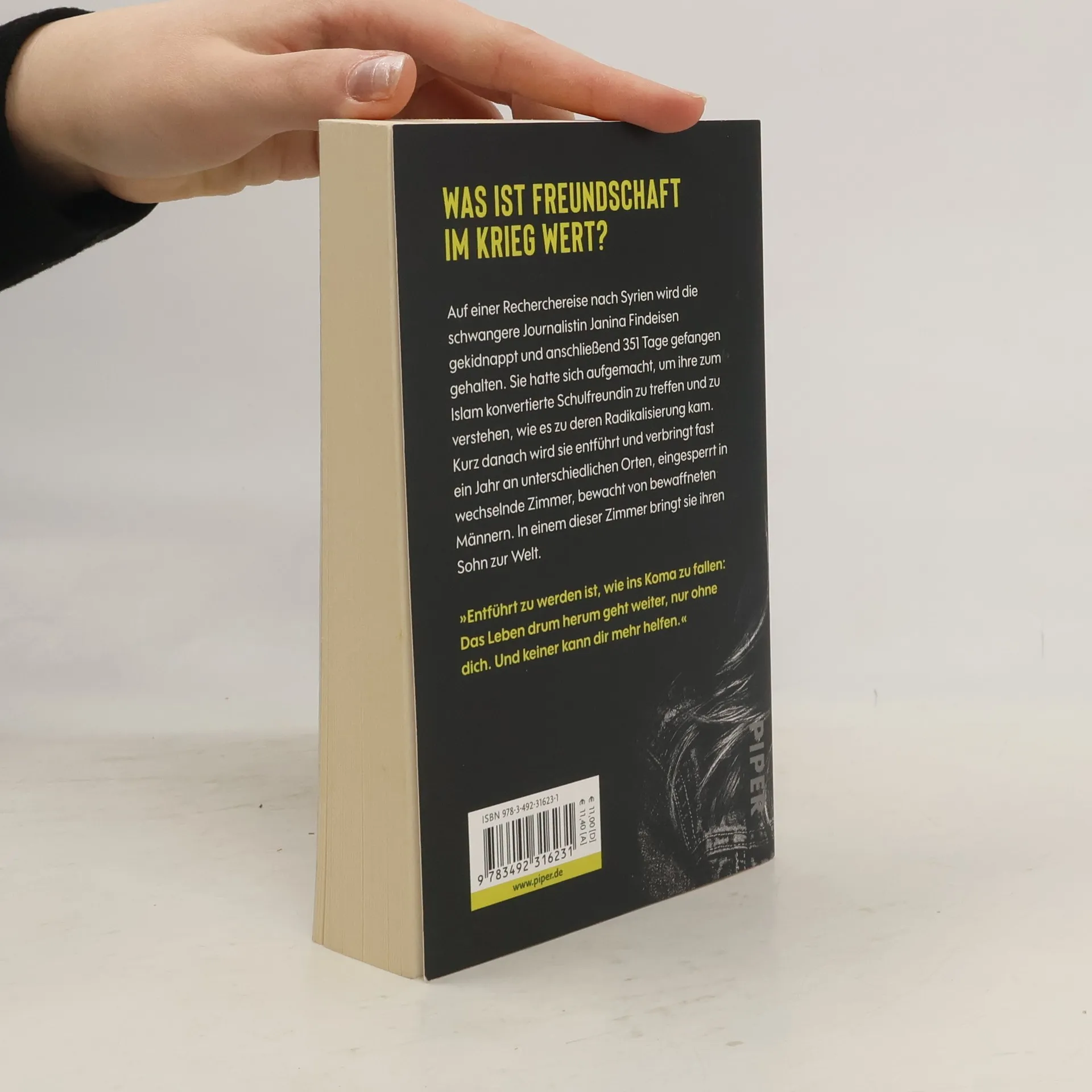Was ist Freundschaft im Krieg wirklich wert? »Entführt zu werden ist, wie ins Koma zu fallen: Das Leben drum herum geht weiter, nur ohne dich. Du bist plötzlich nicht mehr dabei, aber du bist trotzdem noch bei vollem Bewusstsein. Bloß kannst du nichts mehr tun, und keiner kann dir mehr helfen.« Die Journalistin Janina Findeisen wird 2015 auf einer Recherchereise in Syrien gekidnappt und anschließend 351 Tage gefangen gehalten. Sie war nach Syrien gereist, um ihre zum Islam konvertierte Schulfreundin zu treffen und zu verstehen, wie es zu deren Radikalisierung kam. Kurz nach dem Treffen wird sie, die ihr erstes Kind erwartet, entführt. Sie verbringt fast ein Jahr an unterschiedlichen Orten, in wechselnde Zimmer eingesperrt, von bewaffneten Männern bewacht. In einem dieser Zimmer bringt sie ihren Sohn zur Welt.