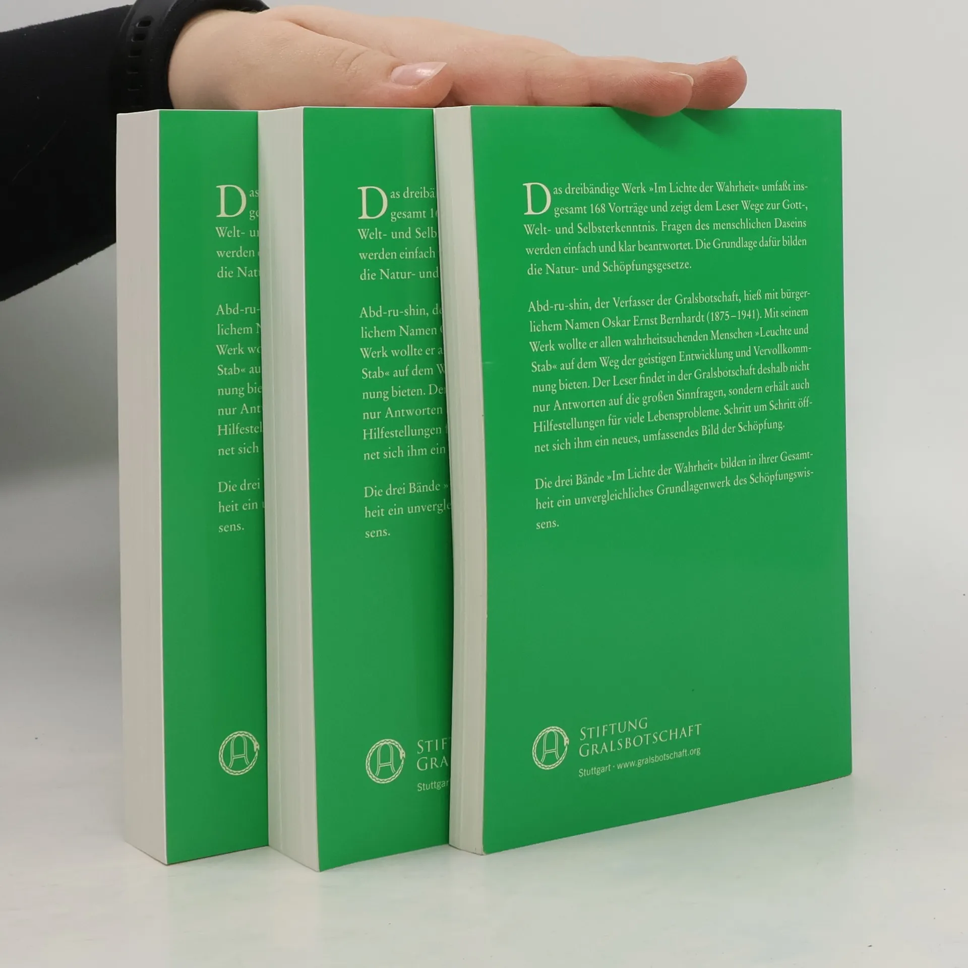 Das dreibändige Werk »Im Lichte der Wahrheit – Gralsbotschaft« von Abd-ru-shin ist eine zeitlose Erkenntnisquelle. Die 168 Vorträge erschließen dem Leser die großen Sinnzusammenhänge in der Schöpfung: Leben und Tod, Schicksal und Reinkarnation, Diesseits und Jenseits. Die Erklärungen des Werkes »Im Lichte der Wahrheit« bauen auf der Grundlage einfacher, verständlicher Naturgesetze auf, die in der Außenwelt ebenso wirksam sind wie im seelischen Innenleben. Sie sprechen typisch menschliche Erfahrungen an, zeigen Stärken und Schwächen auf und weisen auf verborgene Unzulänglichkeiten hin – aber auch auf die vielen Gelegenheiten, die das tägliche Leben für den geistigen Fortschritt bietet. Der Leser hat damit die Möglichkeit, den Inhalt der Vorträge im eigenen Leben wiederzuentdecken und als wahr zu erkennen.