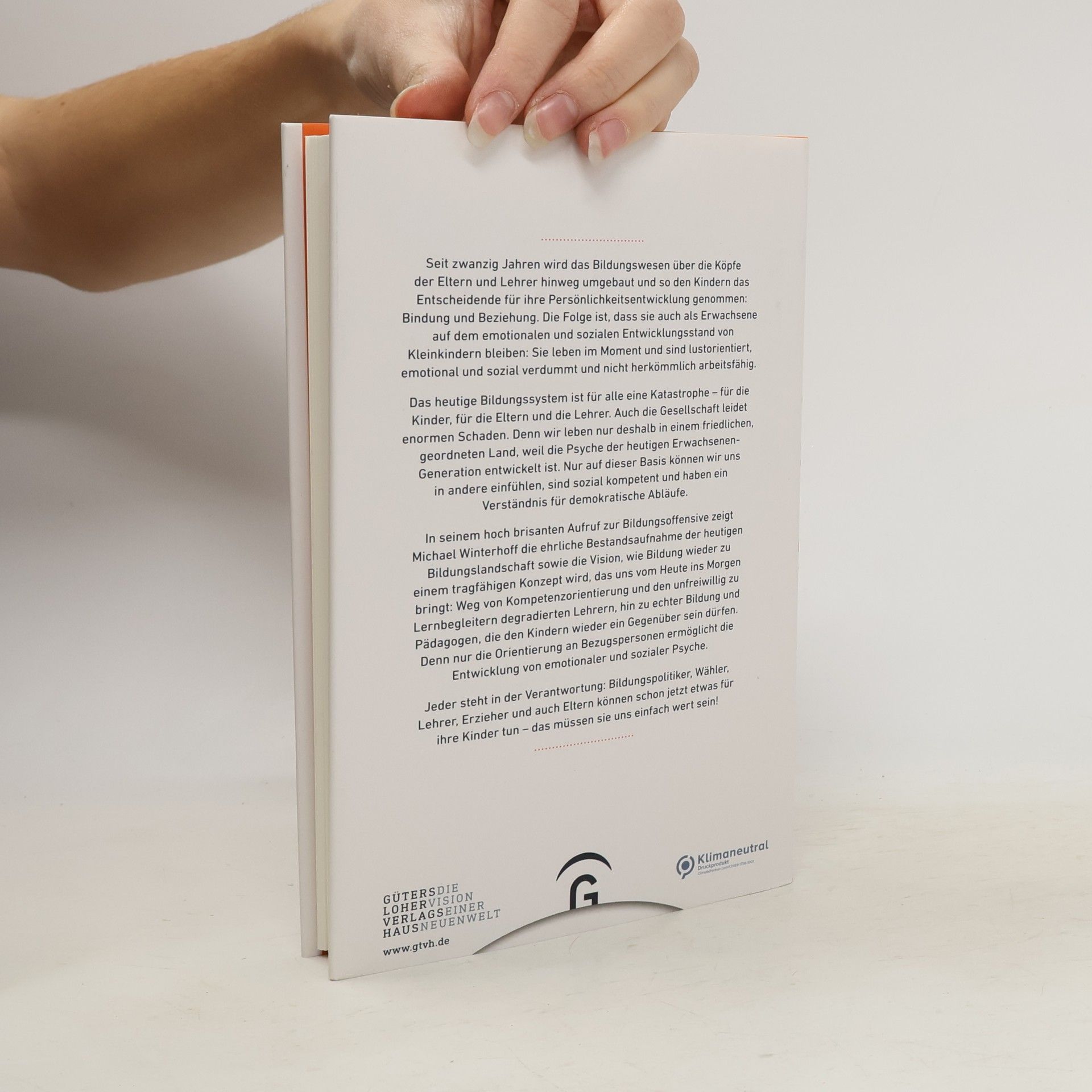Bildung in Deutschland: eine Katastrophe. Kinder und Gesellschaft nehmen Schaden! Michael Winterhoff redet Klartext, zeigt anhand vieler Beispiele aus seiner langjährigen Praxis als Kinder- und Jugendpsychiater, aber auch aus zahlreichen Rückmeldungen zu seinen Büchern und Vorträgen, was heute in Kitas und Schulen falsch läuft – so falsch, dass in seinen Augen die Zukunft unserer Gesellschaft gefährdet ist. Leidtragende sind für ihn die Kinder, die man quasi sich selbst überlässt. Winterhoff verharrt nicht bei der Bestandsaufnahme und Analyse, er zeigt konkrete Lösungen und Maßnahmen auf und fordert u. a. eine groß angelegte Bildungsoffensive: Weg von Kompetenzorientierung und den unfreiwillig zu Lernbegleitern degradierten Lehrern, hin zu echter Bildung und Pädagogen, die den Kindern wieder ein Gegenüber sein dürfen. Denn nur die Orientierung an Bezugspersonen ermöglicht die Entwicklung von emotionaler und sozialer Psyche.