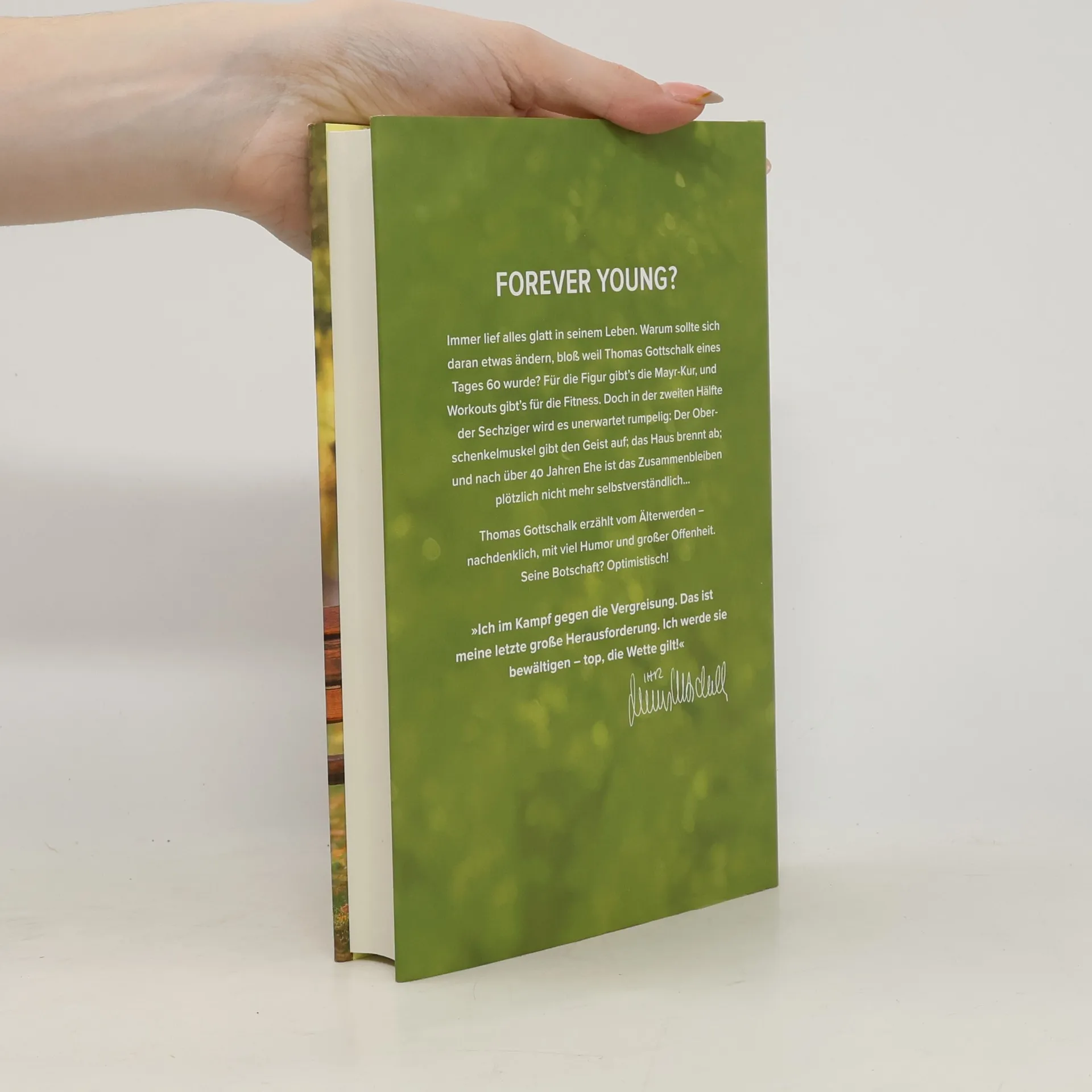 Forever young? Immer lief alles glatt in seinem Leben. Warum sollte sich daran etwas ändern, bloß weil Thomas Gottschalk eines Tages 60 wurde? Für die Figur gibt’s die Mayr-Kur, und Workouts gibt’s für die Fitness. Doch in der zweiten Hälfte der Sechziger wird es unerwartet rumpelig: Der Oberschenkelmuskel gibt den Geist auf; das Haus brennt ab; und nach über 40 Jahren Ehe ist das Zusammenbleiben plötzlich nicht mehr selbstverständlich… Thomas Gottschalk erzählt vom Älterwerden – nachdenklich, mit viel Humor und großer Offenheit. Seine Botschaft? Optimistisch! »Ich im Kampf gegen die Vergreisung. Das ist meine letzte große Herausforderung. Ich werde sie bewältigen – top, die Wette gilt!« Thomas Gottschalk