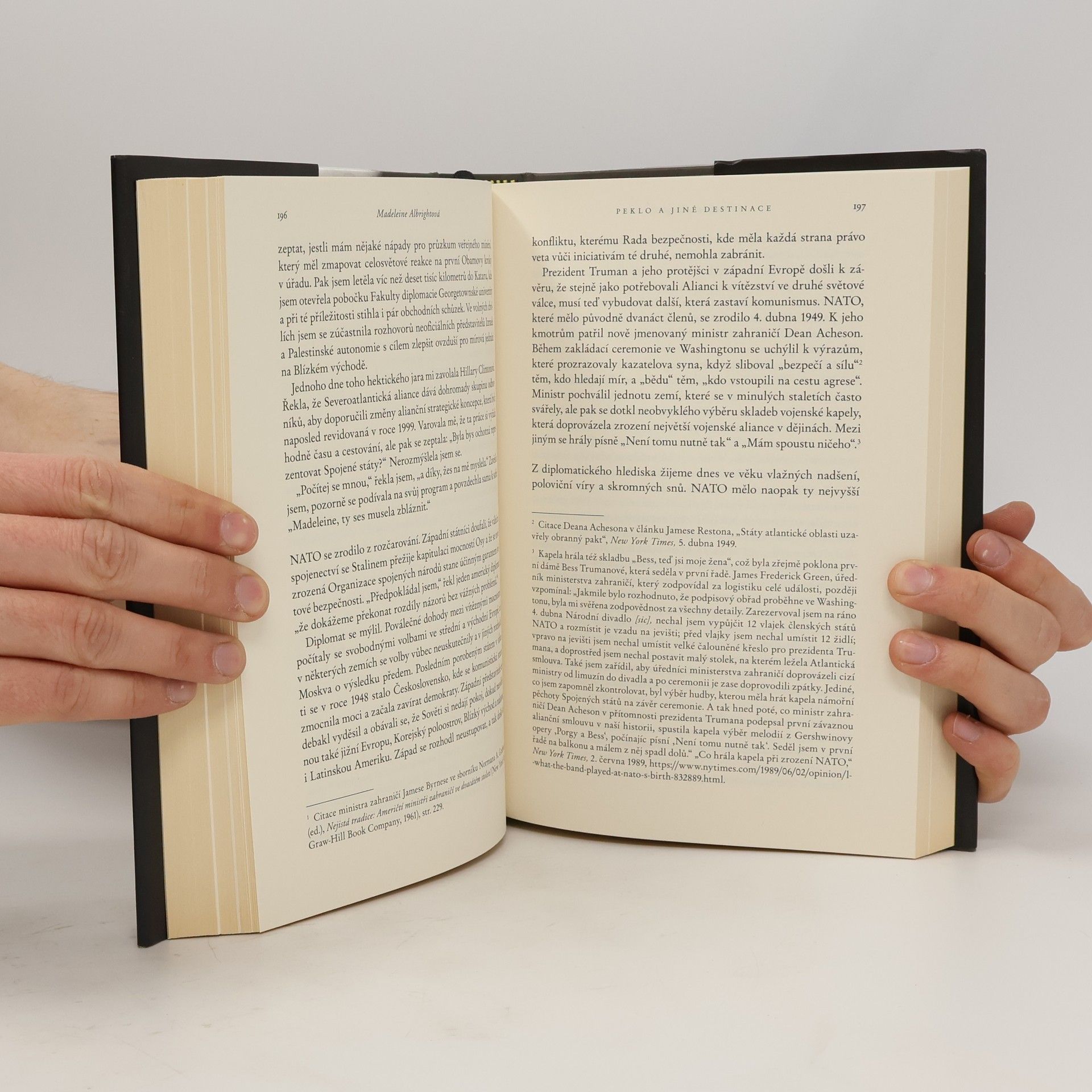 V roce 2001, po ukončení své funkce ministryně zahraničí, se Madeleine Albrightová vrhla do nové kariéry, která by vydala na několik životů. Začala psát knihy, učit na univerzitě, zakládala konzultační firmu a investiční fond, a zároveň se angažovala v prosazování demokratických hodnot. V debatách se střetávala s významnými politiky a ve svých knihách varovala před návratem fašismu, podporovala práva žen a pomáhala těm, kteří nemají možnost být slyšet. Jako matka tří dcer začala pracovat na plný úvazek až v devětatřiceti letech, přičemž zdůrazňuje, že jakmile našla svůj hlas, byla odhodlaná ho nechat zaznít. Její nová kniha, nazvaná Peklo a jiné destinace, nabízí zábavnou a osobní rekapitulaci jejího „života po politické smrti“. Albrightová se dělí o důvěrné historky a otevřeně hovoří o nedostatku odvážných lídrů, nutnosti potírat lži a závazku starších generací vůči mladším. Považuje se za „optimistu s obavami“ a nabádá čtenáře, aby si navzájem důvěřovali. Kniha je nejen kronikou naší doby, ale také fascinujícím autoportrétem ženy, která se proslavila nejen politickými úspěchy, ale také osobními zážitky, jako je hraní na bubny před davem nebo tanec s Robertem Redfordem. Albrightová se zde představuje s vtipem, šarmem a upřímností.