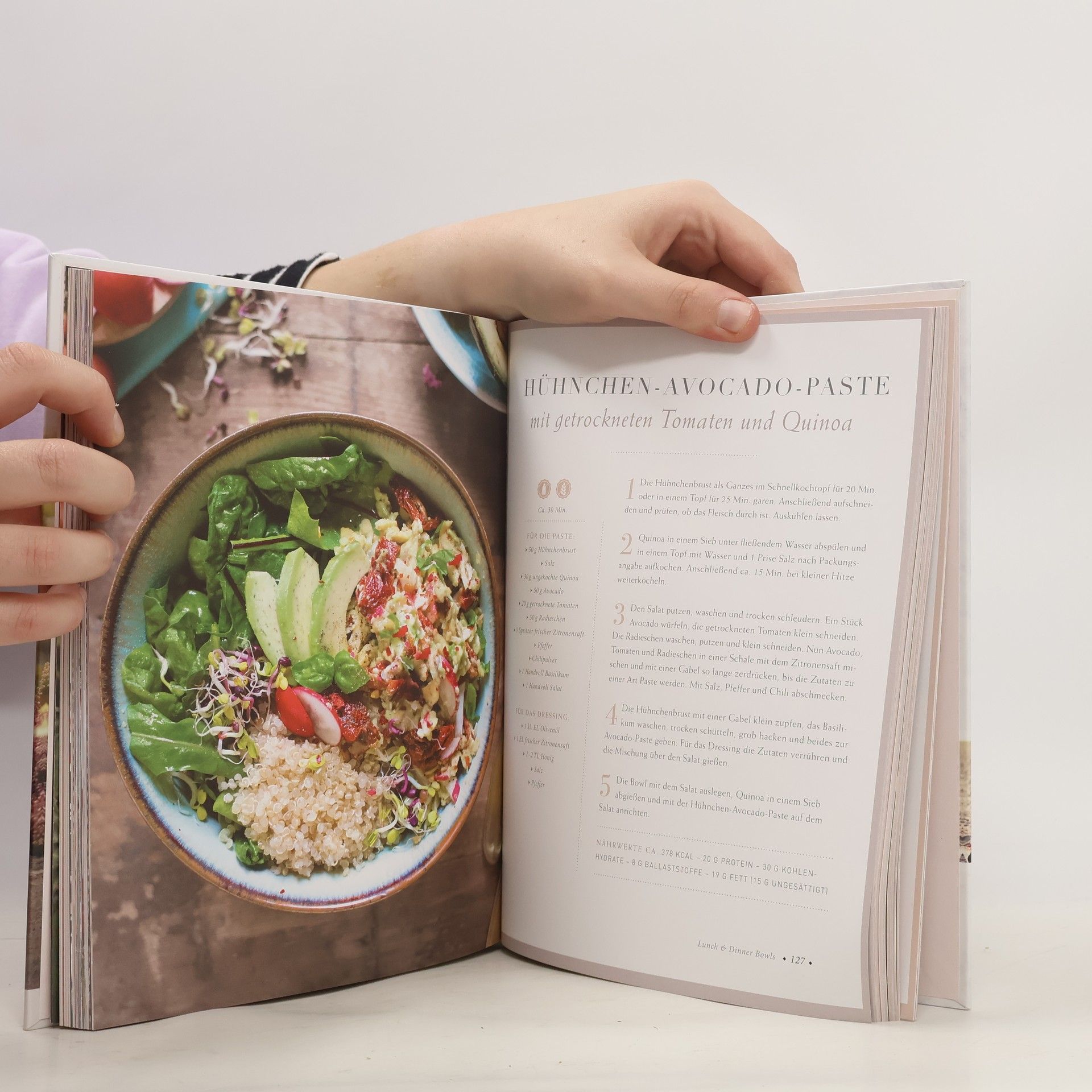 Über 70 gesunde, ausgewogene und leckere Bowl-Rezepte von Fitness-Vorbild Pamela Reif! Gesunde und natürliche Ernährung ist das, was Körper und Seele täglich verdienen und hat nichts mit Verzicht zu tun. Sich langfristig großartig zu fühlen und der Gesundheit etwas Gutes zu tun, ist auch im Alltag möglich - mit Bowls! Einfache, natürliche und vollwertige Gerichte werden ohne stundenlange Küchenarbeit in schönen Schalen angerichtet. Pamela Reif hat ihre liebsten Rezepte fotografiert und niedergeschrieben. Ergänzt wird das Kochbuch durch eine grundlegende Lebensmittelkunde, die die Vorteile dieser ausgewogenen Ernährung leicht verständlich erläutert. Die ultimative Ernährungsformel ist nicht zwangsläufig „low carb“ oder „low fat“ - entscheidend ist, dass die Nahrung „echt“ und natürlich ist. Das Herzstück sind über 80 abwechslungsreiche Bowl-Rezepte für jede Tages- und Mahlzeit: Breakfast-Bowls, Smoothie-Bowls, Lunch- & Dinner-Bowls, Sweet Bowls und Sides. Ob süße Apfelkuchen-Smoothie-Bowl, herzhafte Spinat-Kichererbsen-Pfannkuchen, bunte Buddha-Bowl oder Brownie-Bowl: Hier kann ohne schlechtes Gewissen geschlemmt werden. Mit Symbolen sind die Rezepte einfach in vegetarisch, vegan, mit Fleisch, glutenfrei oder laktosefrei einzuordnen. Ausbalancierte Rezepte und wertvolles Ernährungswissen bilden die ideale Grundlage, um den eigenen Lebensstil unkompliziert und genussvoll zu verändern - für ein ausgeglichenes Leben. Because you