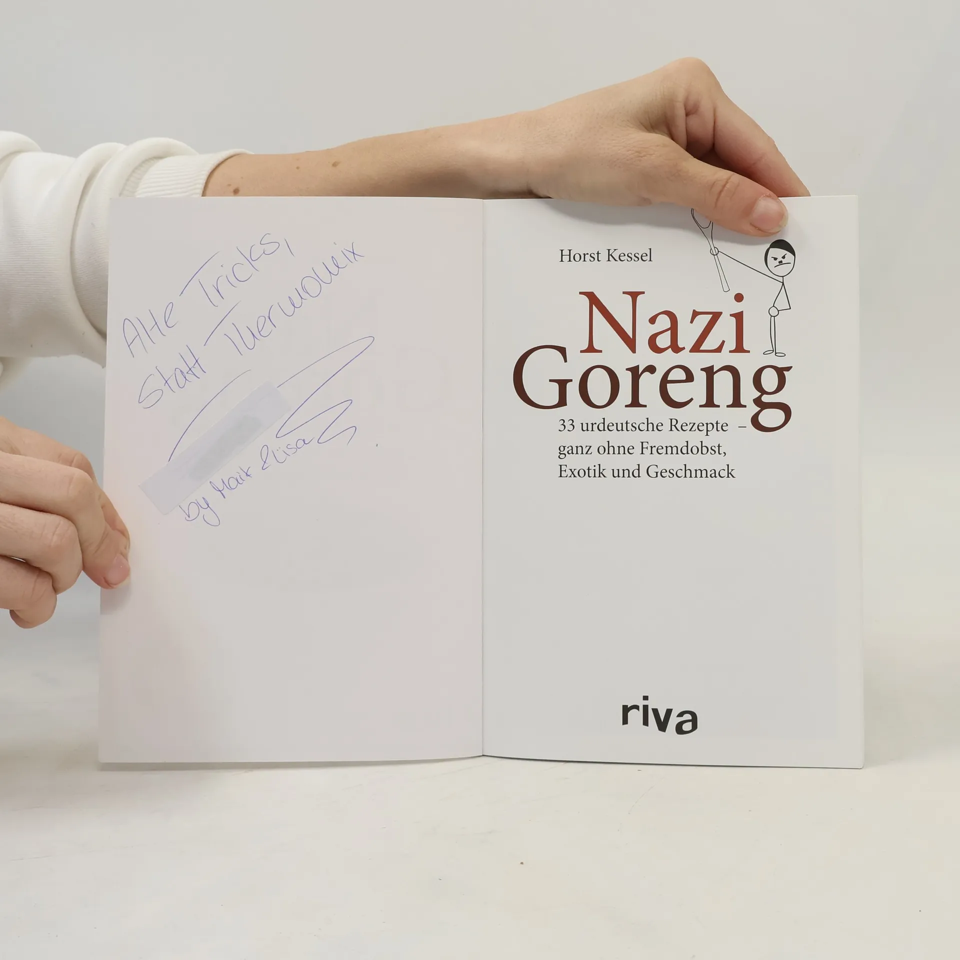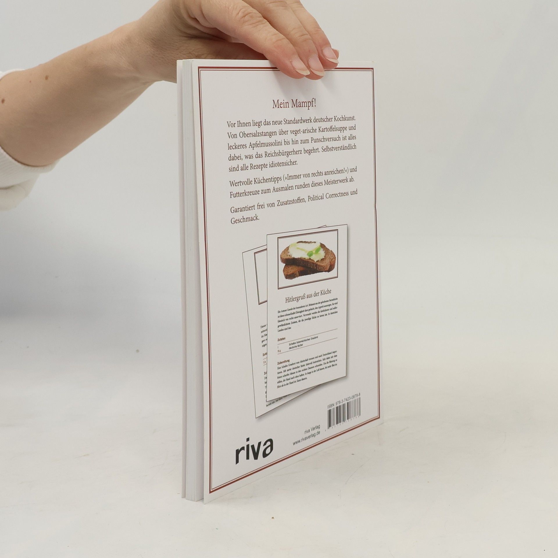 Mein Mampf! Vor Ihnen liegt das neue Standardwerk deutscher Kochkunst. Von Obersalzstangen über veget-arische Kartoffelsuppe und leckeres Apfelmussolini bis hin zum Punschversuch ist alles dabei, was das Reichsbürgerherz begehrt. Selbstverständlich sind alle Rezepte idiotensicher. Wertvolle Küchentipps (»Immer von rechts anreichen!«) und Futterkreuze zum Ausmalen runden dieses Meisterwerk ab. Garantiert frei von Zusatzstoffen, Political Correctness und Geschmack.