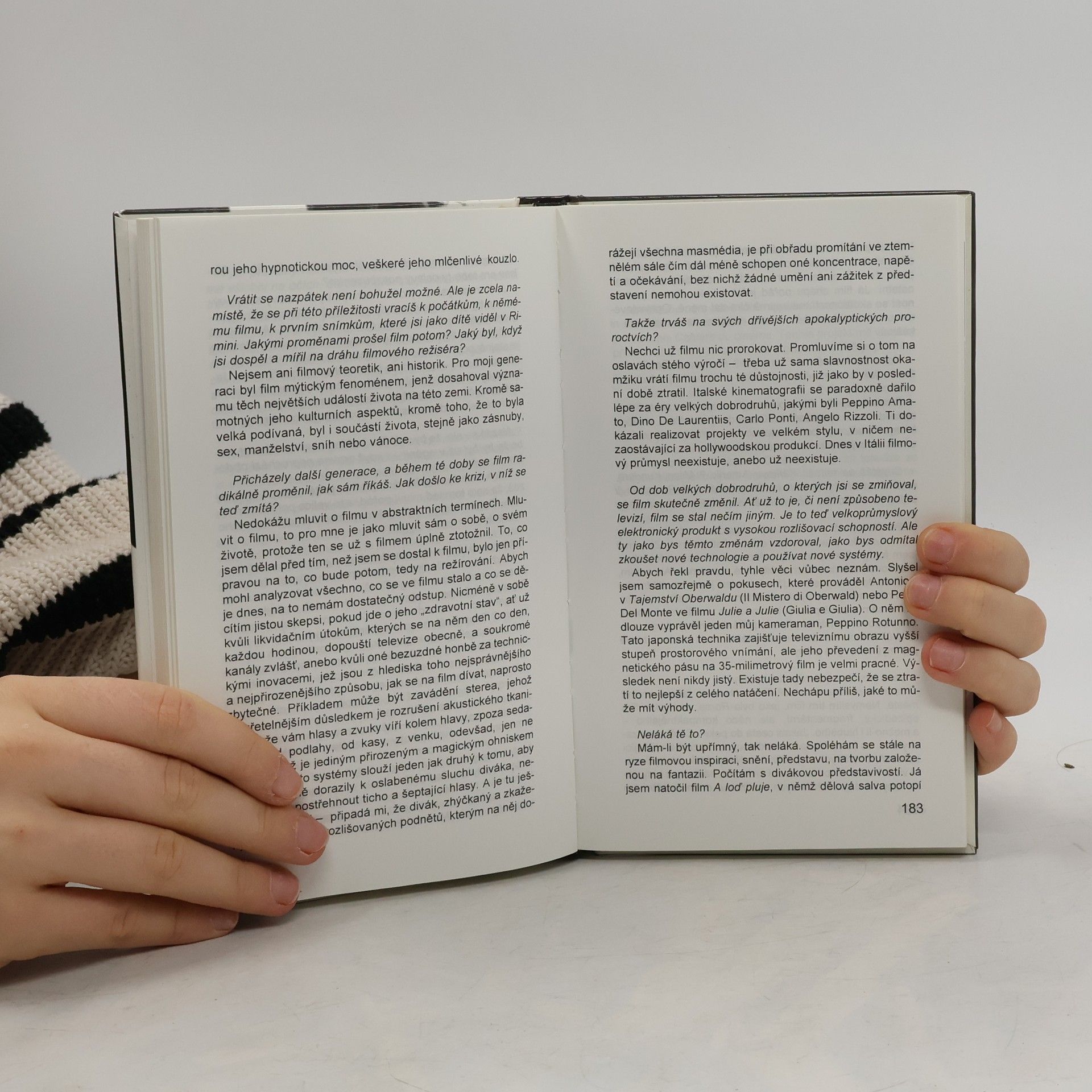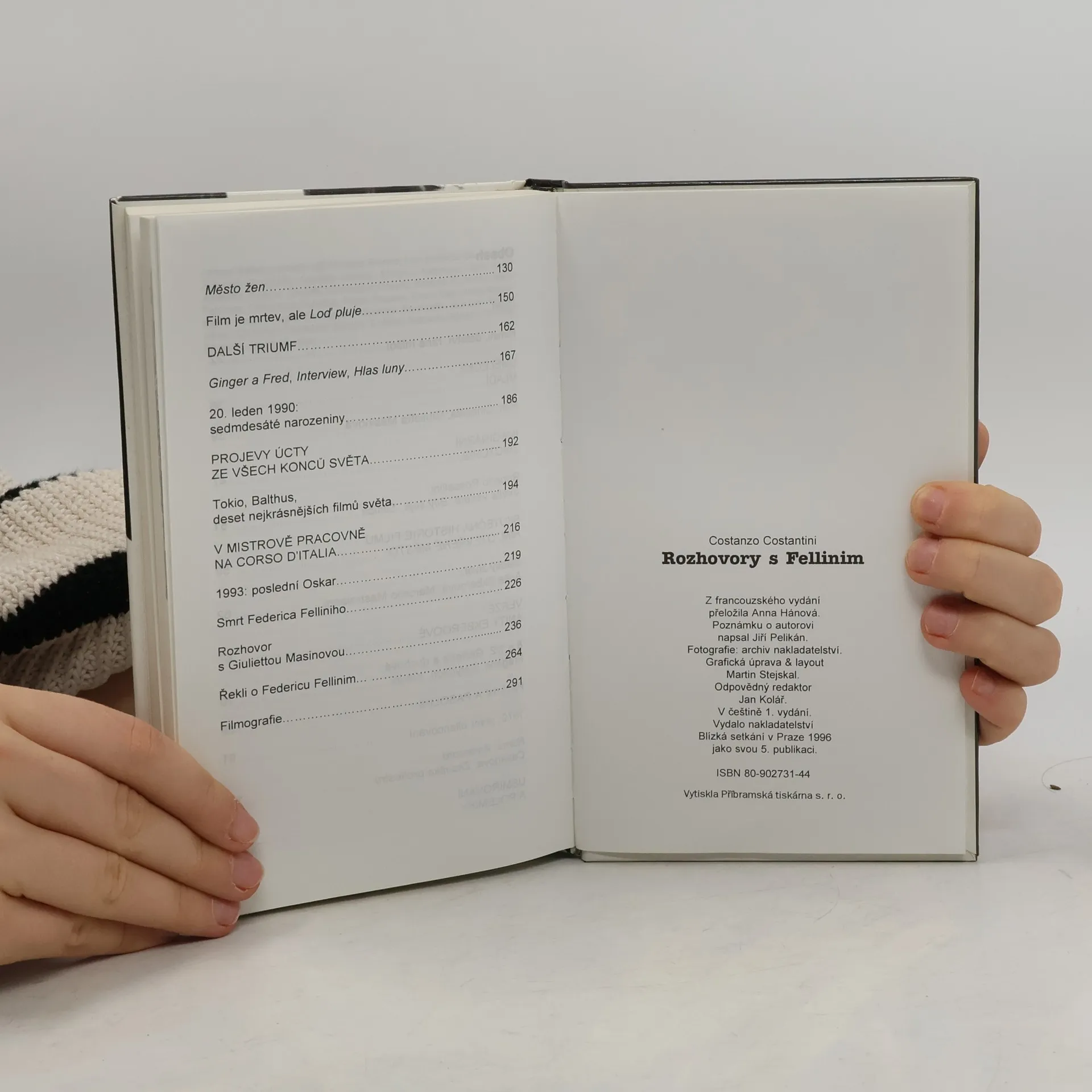 Z francouzského vydání, které vydalo Éditions Denoël v Paříži 1995. Kniha je sledem rozhovorů známého italského publicisty s Federicem Fellinim, s nímž se seznámil už ve druhé polovině 50. let. Výběr rozhovorů z let 1961-1993 postihuje prakticky celou Felliniho režijní dráhu a jeho filmy.Jednotlivé rozhovory jsou proloženy krátkými autorovými vzpomínkami na události, které s Felliniho tvorbou souvisejí. V závěru je připojen také rozhovor s Giuliettou Masinovou (s. 236-263) z roku 1989 a výběr názorů známých osobností na Felliniho dílo (s. 264-270). Kniha je doplněna fotografickou přílohou (v nepříliš dobré kvalitě) a opravdu podrobnou filmografií.
