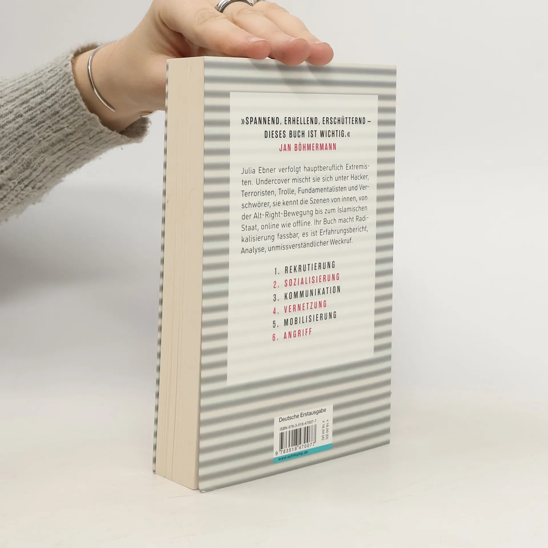 „Spannend, erhellend, erschütternd – dieses Buch ist wichtig.“ Jan Böhmermann Julia Ebner verfolgt hauptberuflich Extremisten. Undercover mischt sie sich unter Hacker, Terroristen, Trolle, Fundamentalisten und Verschwörer, sie kennt die Szenen von innen, von der Alt-Right-Bewegung bis zum Islamischen Staat, online wie offline. Ihr Buch macht Radikalisierung fassbar, es ist Erfahrungsbericht, Analyse, unmissverständlicher Weckruf. Als Extremismusforscherin stellen sich ihr folgende Fragen: Wie rekrutieren, wie mobilisieren Extremisten ihre Anhänger? Was ist ihre Vision der Zukunft? Mit welchen Mitteln wollen sie diese Vision erreichen? Um Antworten zu finden, schleust sich Julia Ebner ein in zwölf radikale Gruppierungen quer durch das ideologische Spektrum. Sozusagen von der anderen Seite beobachtet sie Planungen terroristischer Anschläge, Desinformationskampagnen, Einschüchterungsaktionen, Wahlmanipulationen. Sie erkennt, Radikalisierung folgt einem klaren Skript: Rekrutierung, Sozialisierung, Kommunikation, Mobilisierung, Angriff.
