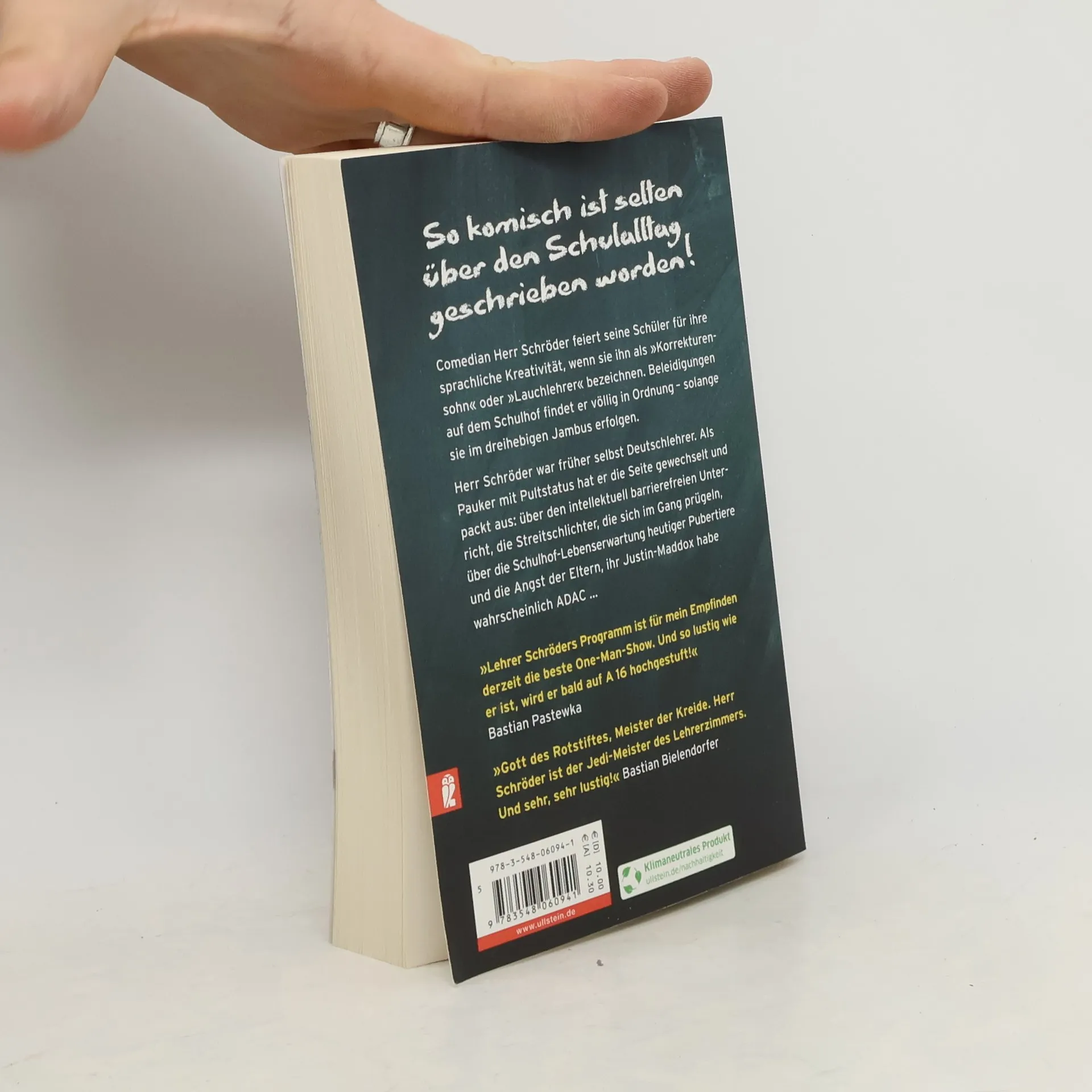 So komisch ist selten über den Schulalltag geschrieben worden! Comedian Herr Schröder feiert seine Schüler für ihre sprachliche Kreativität, wenn sie ihn als „Korrekturensohn“ oder „Lauchlehrer“ bezeichnen. Beleidigungen auf dem Schulhof findet er völlig in Ordnung – solange sie im dreihebigen Jambus erfolgen. Herr Schröder war früher selbst Deutschlehrer. Als Pauker mit Pultstatus hat er die Seite gewechselt und packt aus: über den intellektuell barrierefreien Unterricht, die Streitschlichter, die sich im Gang prügeln, über die Schulhof-Lebenserwartung heutiger Pubertiere und die Angst der Eltern, ihr Justin-Maddox habe wahrscheinlich ADAC …