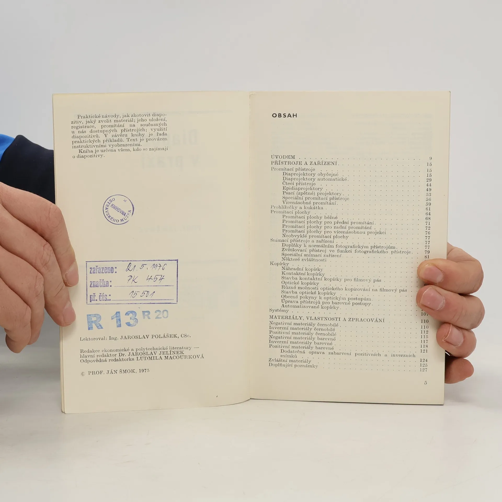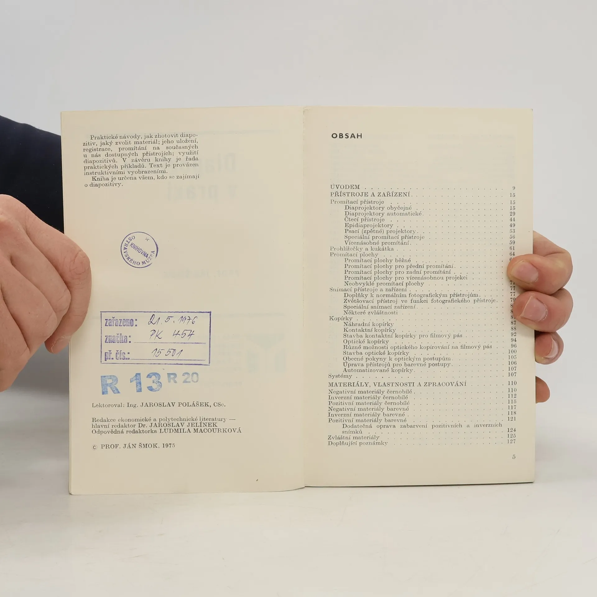 Praktická příručka seznamuje s přístroji a zařízením ke zhotovování a promítání diapozitivů, s negativními, inverzními i pozitivními materiály a s postupem při zhotovování diapozitivu. Všímá si úpravy, uložení a registrace diapásů, mikrofilmů, mikrofiší a diapozitivů a jejich promítání. Upozorňuje na široké možnosti využívání diapozitivů a uvádí různé pokusy a zajímavosti, při nichž se využívá směsi barevných světel, zvláštnosti barevného vidění, aditivních filtrů apod.