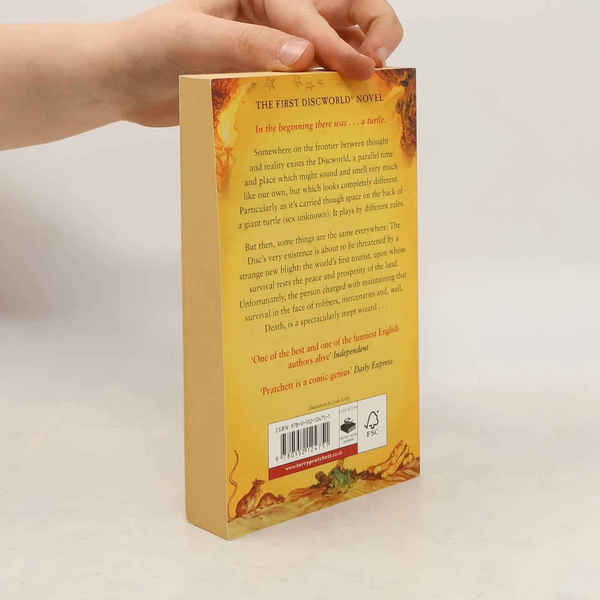 On a world supported on the back of a giant turtle (sex unknown), a gleeful, explosive, wickedly eccentric expedition sets out. There's an avaricious buy inept wizard, a naïve tourist whose luggage moves on hundreds of dear little legs, dragons who only exist ifyou believe in them, and of course THE EDGE of the planet...
