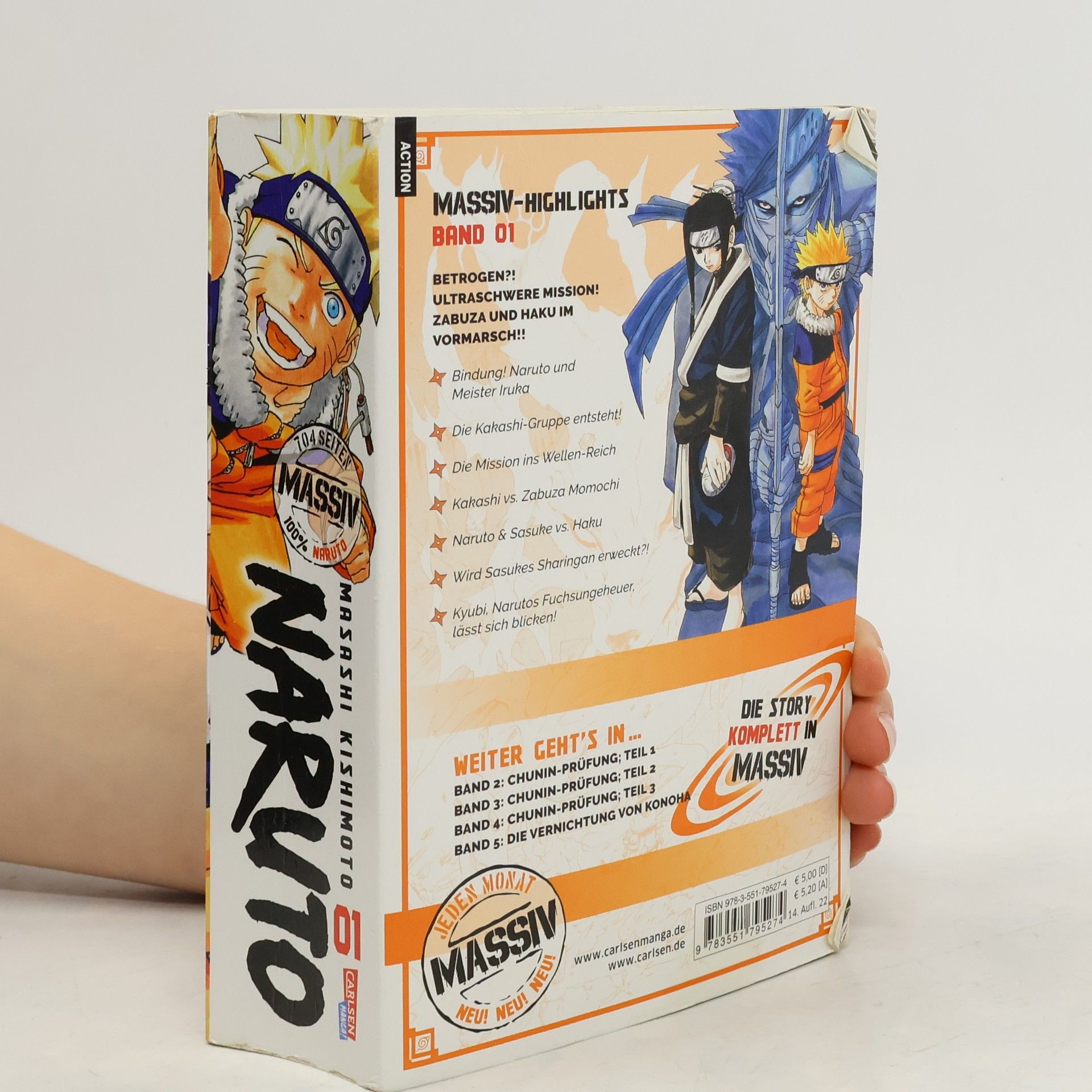 Erlebe atemberaubende Abenteuer und Ninja-Action mit NARUTO! Jetzt als tolle Sammelbandedition mit insgesamt 24 Bänden im größeren Format und neuen Covermotiven! Naruto ist ein berüchtigter Tunichtgut in seinem Dorf, das fast ausschließlich aus Ninja besteht. Er liebt Nudelsuppe und spielt anderen gern Streiche. So ist es kein Wunder, dass er nicht gerade beliebt ist. Doch gerade deshalb will er der beste Ninja seines Dorfes werden. Zu diesem Zweck gehen er und seine Mitschüler Sasuke und Sakura beim großen Meister Kakashi in die Lehre... Band 1 der Naruto-Massiv Reihe enthält die Kapitel 1 - 33. Für Fans von One Piece, My Hero Academia, Demon Slayer, Jujutsu Kaisen, Dragon Ball, Dr. Stone und Fairy Tail! Massiv-Highlights in Band 1: - Bindung! Naruto und Meister Iruka - Die Kakashi-Gruppe entsteht! - Die Mission ins Wellenreich - Kakashi vs. Zabuza Momochi - Naruto & Sasuke vs. Haku - Wird Sasukes Sharingan erweckt?! - Kyubi, Narutos Fuchsungeheuer, lässt sich blicken!