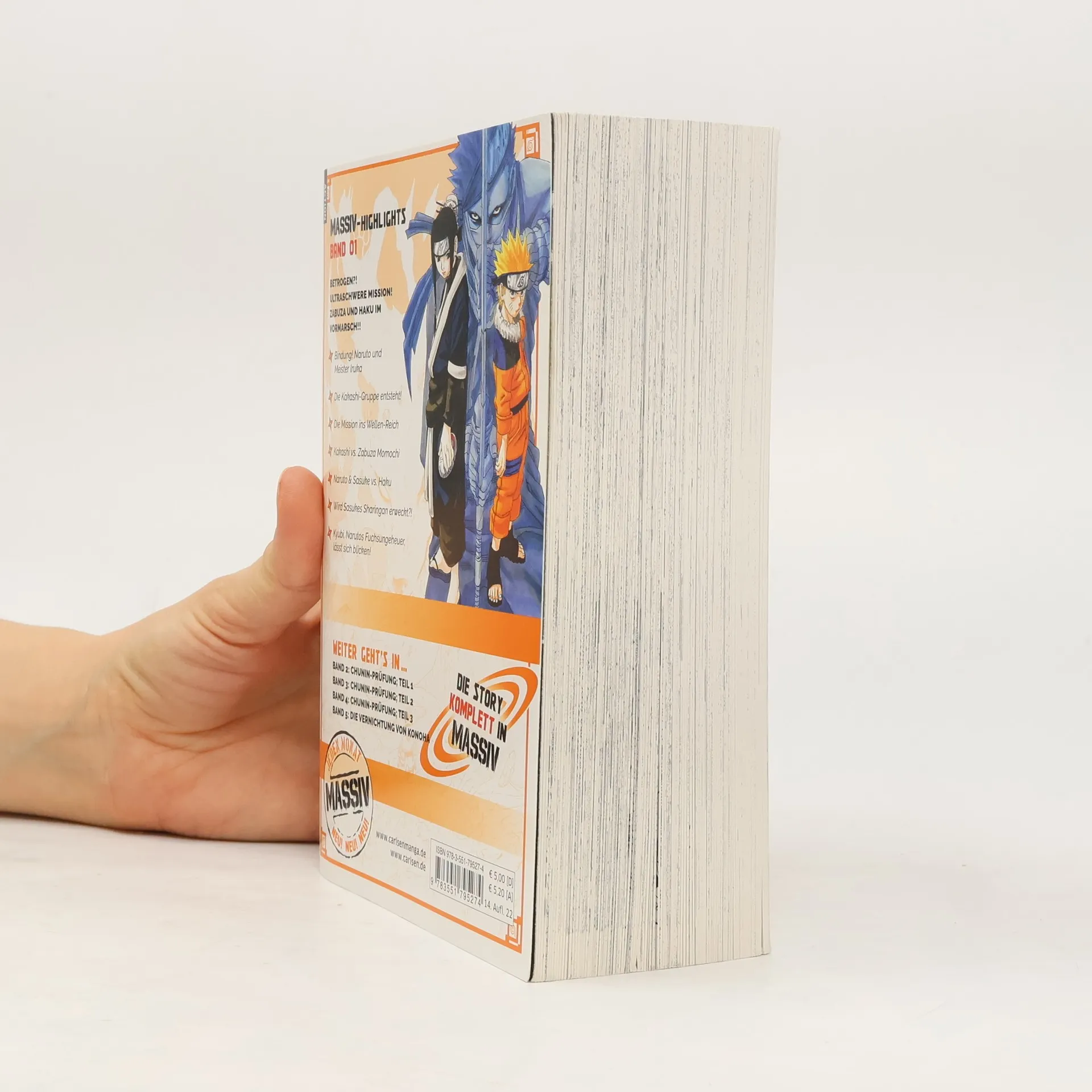 Erlebe atemberaubende Abenteuer und Ninja-Action mit NARUTO! Jetzt als tolle Sammelbandedition mit insgesamt 24 Bänden im größeren Format und neuen Covermotiven! Naruto ist ein berüchtigter Tunichtgut in seinem Dorf, das fast ausschließlich aus Ninja besteht. Er liebt Nudelsuppe und spielt anderen gern Streiche. So ist es kein Wunder, dass er nicht gerade beliebt ist. Doch gerade deshalb will er der beste Ninja seines Dorfes werden. Zu diesem Zweck gehen er und seine Mitschüler Sasuke und Sakura beim großen Meister Kakashi in die Lehre... Band 1 der Naruto-Massiv Reihe enthält die Kapitel 1 - 33. Für Fans von One Piece, My Hero Academia, Demon Slayer, Jujutsu Kaisen, Dragon Ball, Dr. Stone und Fairy Tail! Massiv-Highlights in Band 1: - Bindung! Naruto und Meister Iruka - Die Kakashi-Gruppe entsteht! - Die Mission ins Wellenreich - Kakashi vs. Zabuza Momochi - Naruto & Sasuke vs. Haku - Wird Sasukes Sharingan erweckt?! - Kyubi, Narutos Fuchsungeheuer, lässt sich blicken!