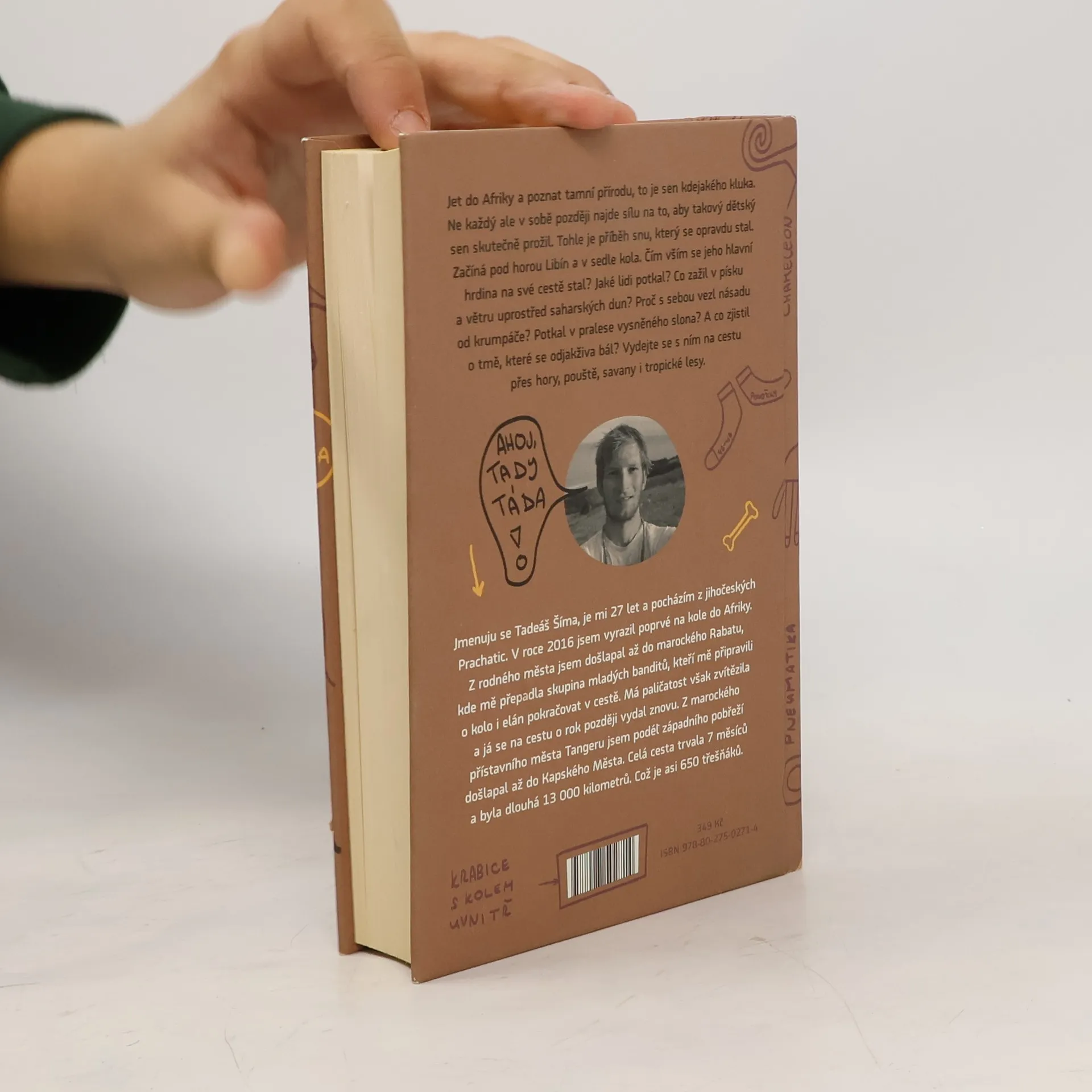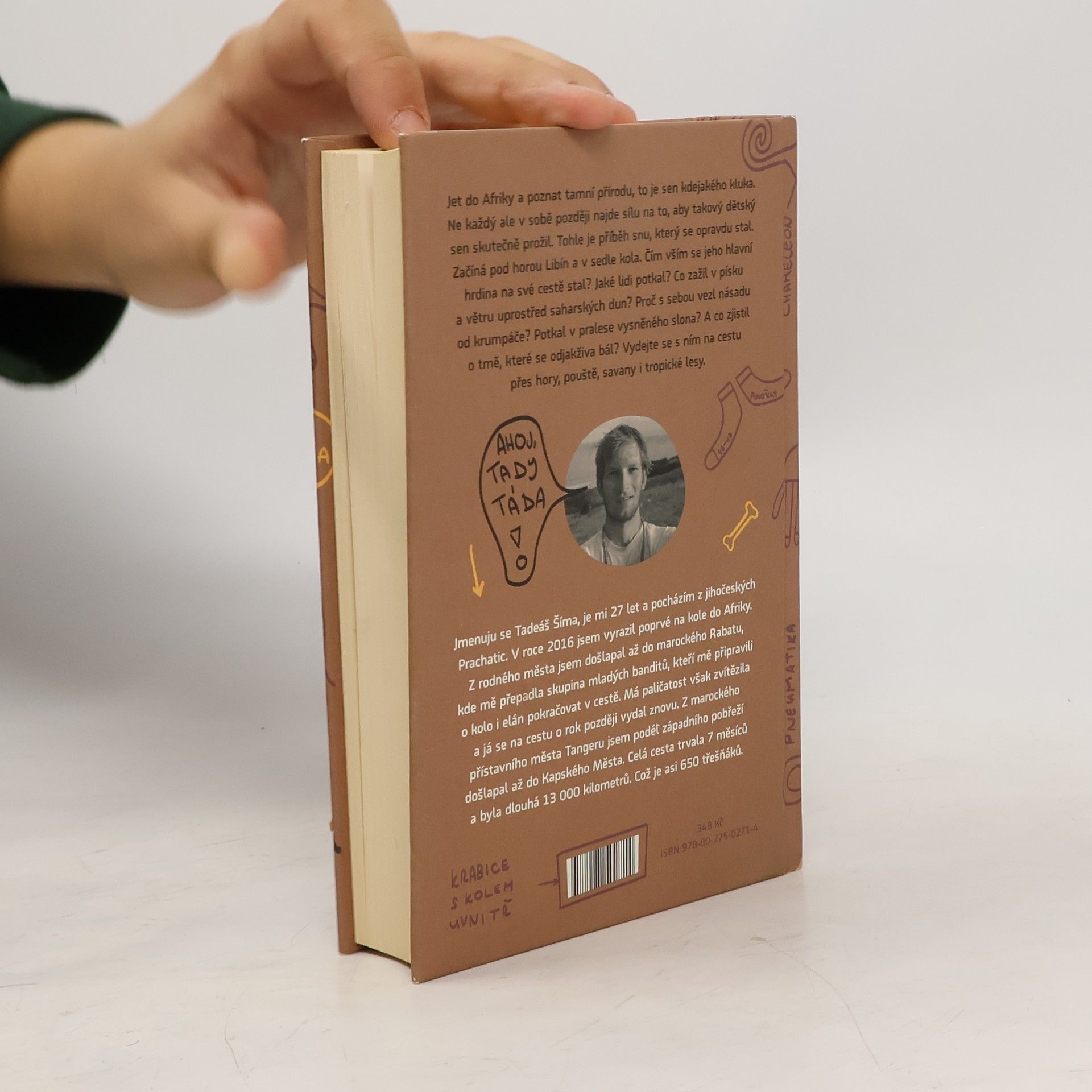 Jet do Afriky a poznat tamní přírodu, to je sen kdejakého kluka. Ne každý ale v sobě později najde sílu na to, aby takový dětský sen skutečně prožil. Tohle je příběh snu, který se opravdu stal. Začíná pod horou Libín a v sedle kola. Čím vším se jeho hlavní hrdina na své cestě stal? Jaké lidi potkal? Co zažil v písku a větru uprostřed saharských dun? Proč s sebou vezl násadu od krumpáče? Potkal v pralese vysněného slona? A co zjistil o tmě, které se odjakživa bál? Vydejte se s ním na cestu přes hory, pouště, savany i tropické lesy. Jmenuji se Tadeáš Šíma, je mi 27 let a pocházím z jihočeských Prachatic. V roce 2016 jsem vyrazil poprvé do Afriky na kole. Z rodného města jsem došlapal až do marockého Rabatu, kde mě přepadla skupina mladých banditů, kteří mě připravili o kolo i elán pokračovat cestě. Má paličatost však zvítězila a já se o rok později na cestu vydal znovu. Z marockého přístavního města Tanger jsem podél západního pobřeží došlapal až do Kapského Města. Celá cesta trvala 7 měsíců a byla dlouhá 13 000 kilometrů. Což je asi 650 Třešňáků. 1 Třešňák = 20 km
