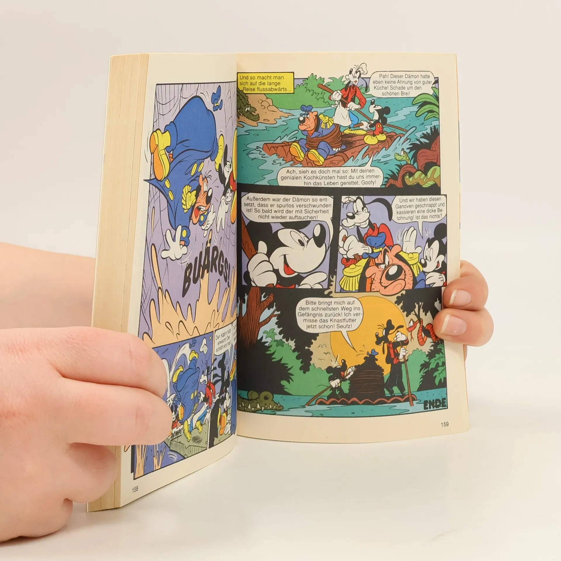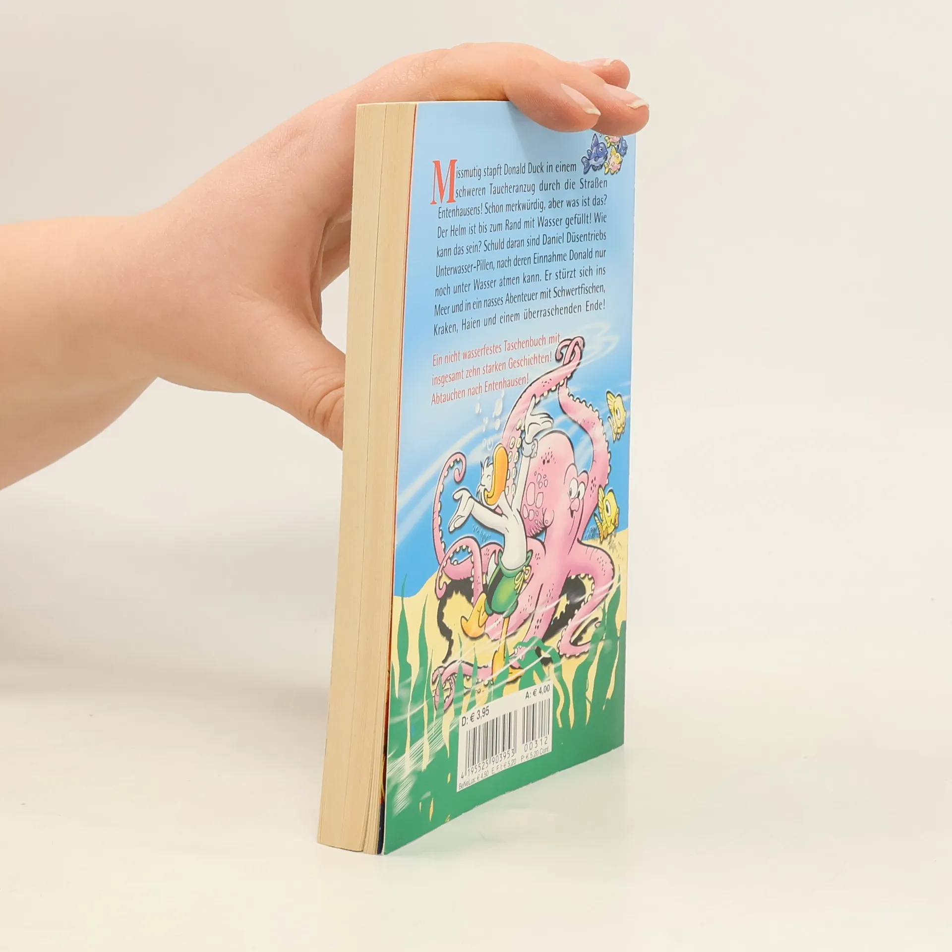Missmutig stapft Donald in einem schweren Taucheranzug durch die Straßen Entenhausens!Schon merkwürdig, aber was ist das? Der Helm ist bis zum Rand mit Wasser gefüllt! Wie kann das sein? Schuld daran sind Daniel Düsentriebs Unterwasser-Pillen, nach deren Einnahme Donald nur noch unter Wasser atmen kann. Er stürzt sich ins Meer und in ein nasses Abenteuer mit Schwertfischen, Kraken, Haien und einen überraschenden Ende.Ein nicht wasserfestes Taschenbuch mit insgesamt zehn starken Geschichten! Abtauchen nach Entenhausen!