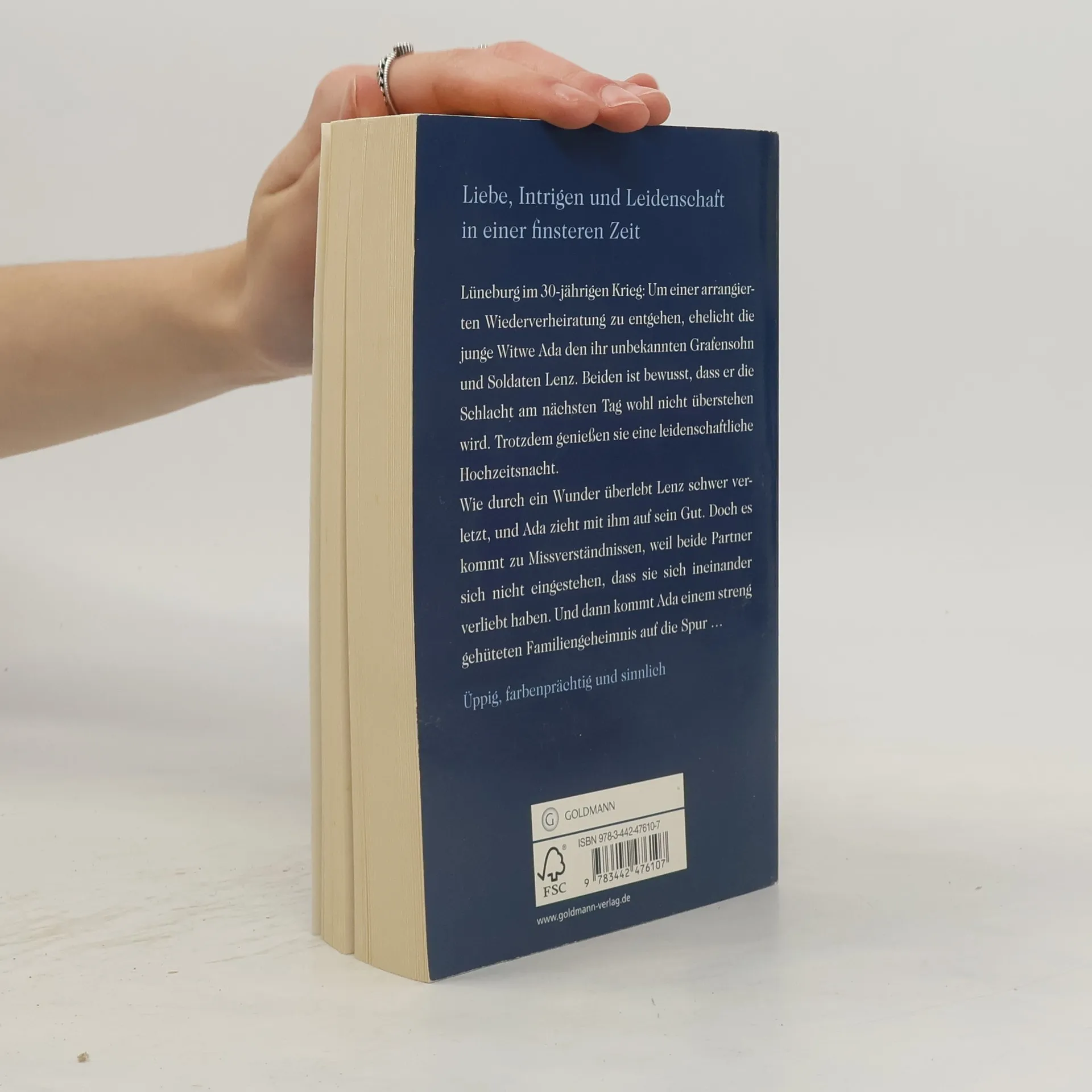 Liebe, Intrigen und Leidenshaft in einer finsteren Zeit Lüneburg im 30-jährigen Krieg: Um einer arrangierten Wiederverheiratung zu entgehen, ehelicht die junge Witwe Ada den ihr unbekannten Grafensohn und Soldaten Lenz. Beiden ist bewusst, dass er die Schlacht am nächsten Tag wohl nicht überstehen wird. Trotzdem genießen sie eine leidenschaftliche Hochzeitsnacht. Wie durch ein Wunder überlebt Lenz schwer verletzt, und Ada zieht mit ihm auf sein Gut. Doch es kommt zu Missverständnissen, weil beide Partner sich nicht engestehen, dass sie sich ineinander verliebt haben. Und dann kommet Ada einem streng gehüeten Familiengeheimnis auf die Spur.... Üppig, farbenprächtig und sinnlich