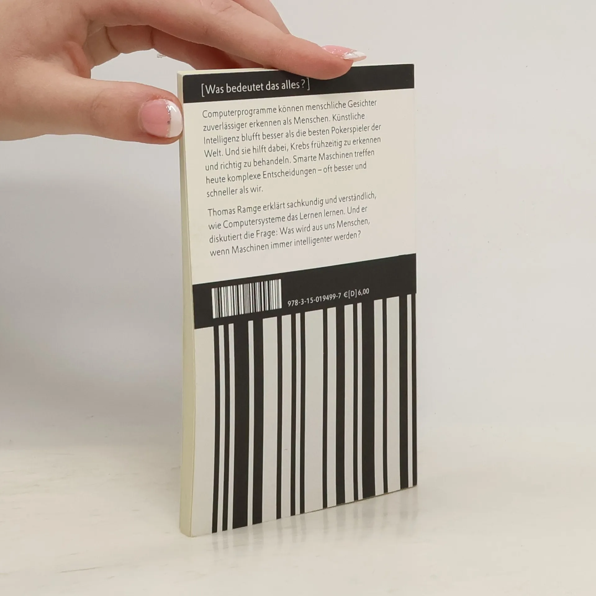 Computerprogramme können menschliche Gesichter zuverlässiger erkennen als Menschen. Sie schlagen uns im Brettspiel Go, das strategisches Denken und Intuition erfordert, und sie bluffen besser als die besten Pokerspieler der Welt. Maschinen treffen komplexe Entscheidungen – oft besser und schneller als wir. Thomas Ramge erklärt sachkundig und verständlich, wie Maschinen dabei sind, das Lernen zu lernen und diskutiert die Frage: Was wird aus uns Menschen, wenn smarte Maschinen immer intelligenter werden?