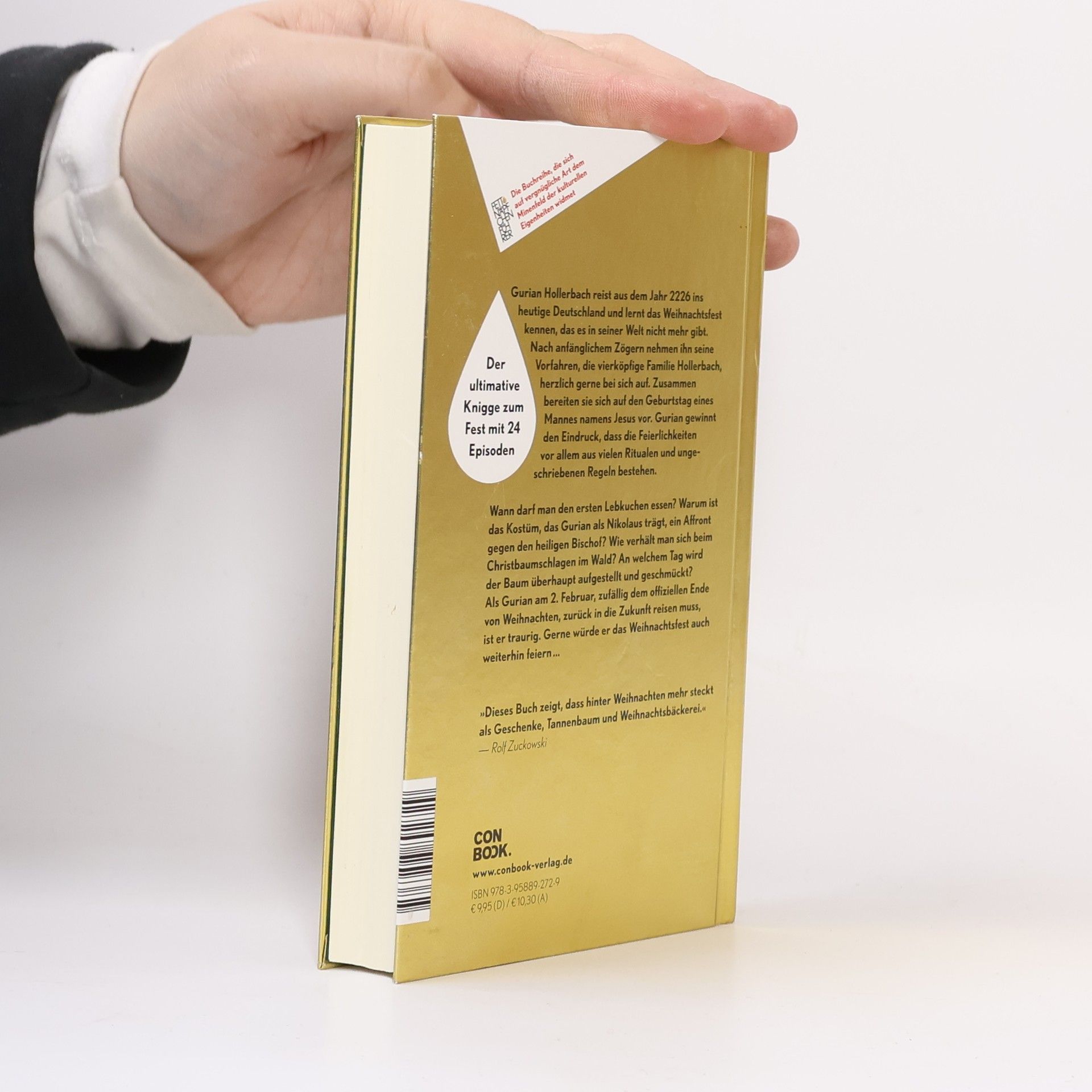 Gurian Hollerbach reist aus dem Jahr 2226 ins heutige Deutschland und lernt das Weihnachtsfest kennen, das es in seiner Welt nicht mehr gibt. Nach anfänglichem Zögern nehmen ihn seine Vorfahren, die vierköpfige Familie Hollerbach, herzlich gerne bei sich auf. Zusammen bereiten sie sich auf den Geburtstag eines Mannes namens Jesus vor. Gurian gewinnt den Eindruck, dass die Feierlichkeiten vor allem aus vielen Ritualen und ungeschriebenen Regeln bestehen. Wann darf man den ersten Lebkuchen essen? Warum ist das Kostüm, das Gurian als Nikolaus trägt, ein Affront gegen den heiligen Bischof? Wie verhält man sich beim Christbaumschlagen im Wald? An welchem Tag wird der Baum überhaupt aufgestellt und geschmückt? Als Gurian am 2. Februar, zufällig dem offiziellen Ende von Weihnachten, zurück in die Zukunft reisen muss, ist er traurig. Gerne würde er das Weihnachtsfest auch weiterhin feiern … Ein weihnachtlicher Kulturführer mit 24 Episoden Infotainment zum Fest »Dieses Buch zeigt, dass hinter Weihnachten mehr steckt als Geschenke, Tannenbaum und Weihnachtsbäckerei.« Rolf Zuckowski