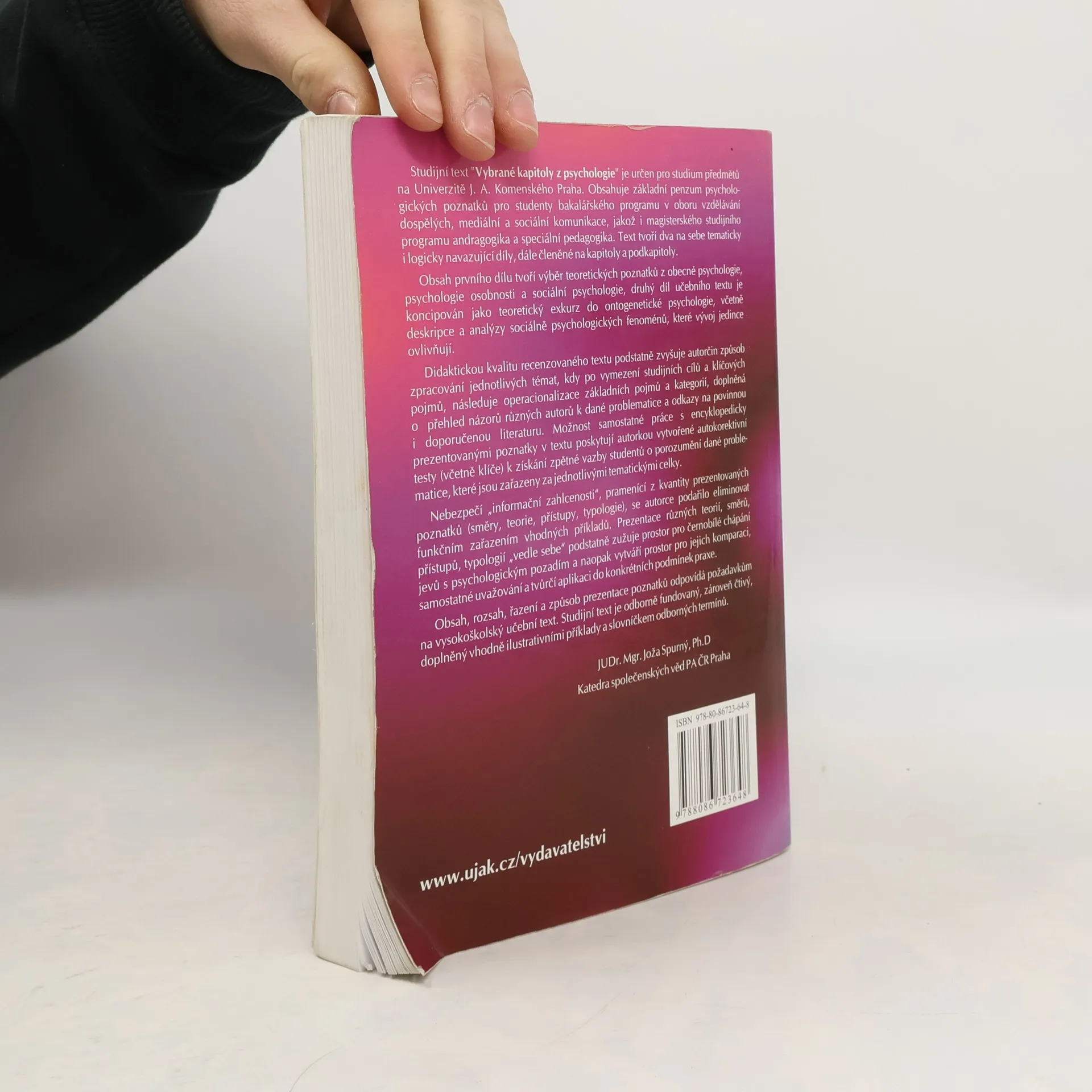 Studijní text obsahuje základní penzum psychologických poznatků pro studenty bakalářského programu v oboru vzdělávání dospělých, mediální a sociální komunikace, jakož i magisterského studijního programu andragogika a speciální pedagogika. Text tvoří dva na sebe tematicky i logicky navazující díly, dále členěné na kapitoly a podkapitoly. Obsah prvního dílu tvoří výběr teoretických poznatků z obecné psychologie, psychologie osobnosti a sociální psychologie, druhý díl učebního textu je koncipován jako teoretický exkurz do ontogenetické psychologie, včetně deskripce a analýzy sociálně psychologických fenoménů, které vývoj jedince ovlivňují.