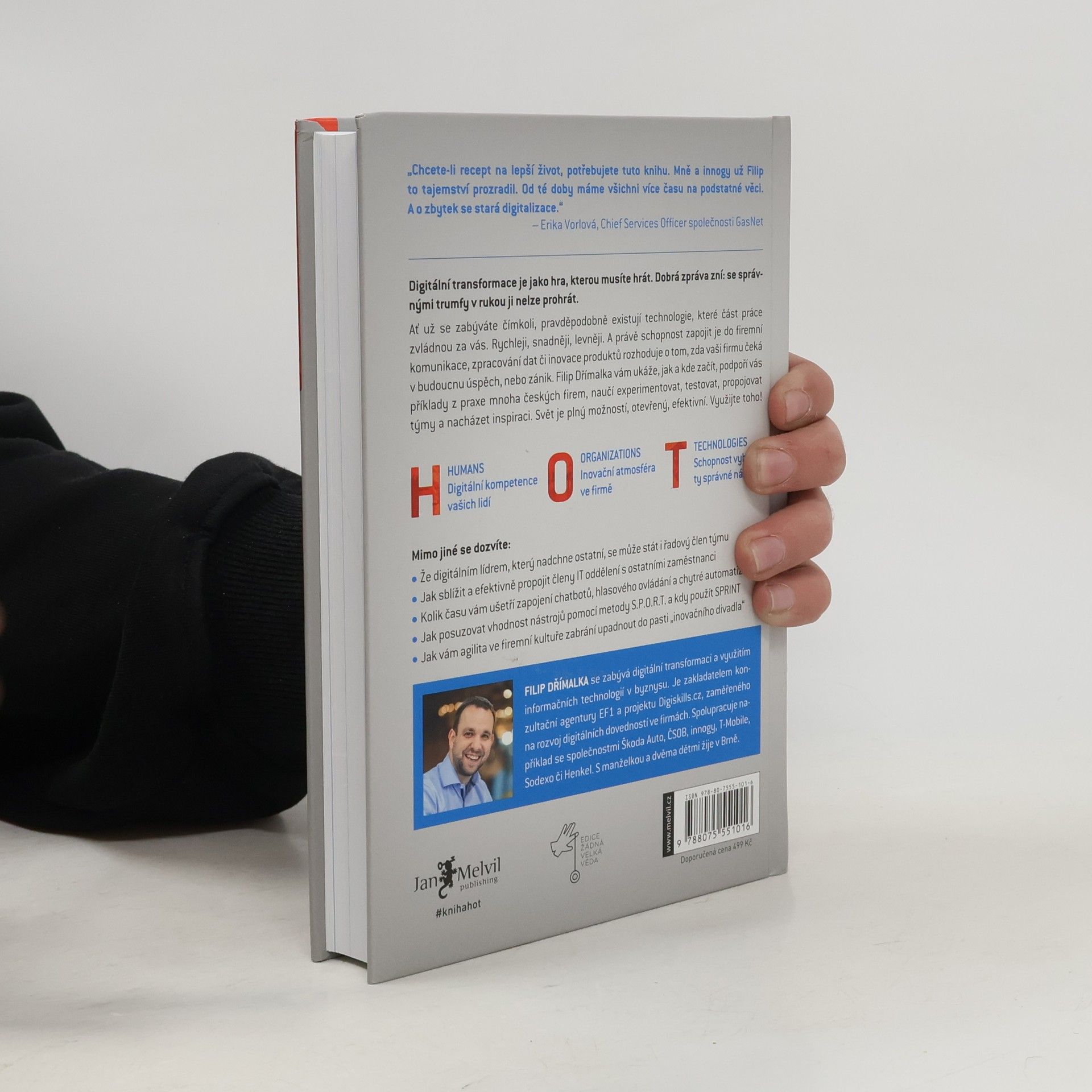 Digitální transformace je jako hra, kterou musíte hrát. Dobrá zpráva zní: se správnými trumfy v rukou ji nelze prohrát. Ať už se zabýváte čímkoli, pravděpodobně existují technologie, které část práce zvládnou za vás. Rychleji, snadněji, levněji. A právě schopnost zapojit je do firemní komunikace, zpracování dat či inovace produktů rozhoduje o tom, zda vaši firmu čeká v budoucnu úspěch, nebo zánik. Filip Dřímalka vám ukáže, jak a kde začít, podpoří vás příklady z praxe mnoha českých firem, naučí experimentovat, testovat, propojovat týmy a nacházet inspiraci. Svět je plný možností, otevřený, efektivní. Využijte toho! H: HUMANS Digitální kompetence vašich lidí O: ORGANIZATIONS Inovační atmosféra ve firmě T: TECHNOLOGIES Schopnost vybrat ty správné nástroje Mimo jiné se dozvíte: - Že digitálním lídrem, který nadchne ostatní, se může stát i řadový člen týmu - Jak sblížit a efektivně propojit členy IT oddělení s ostatními zaměstnanci - Kolik času vám ušetří zapojení chatbotů, hlasového ovládání a chytré automatizace - Jak posuzovat vhodnost nástrojů pomocí metody S.P.O.R.T. a kdy použít SPRINT - Jak vám agilita ve firemní kultuře zabrání upadnout do pasti „inovačního divadla“
