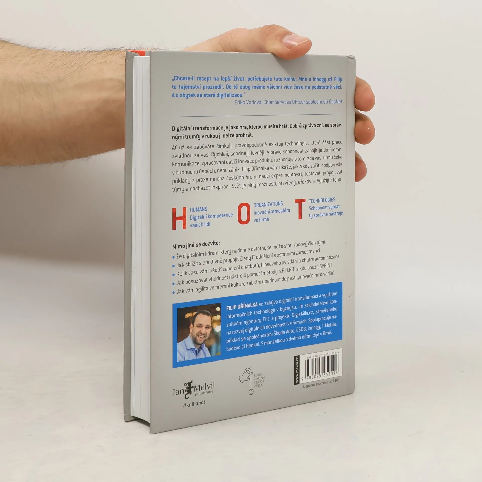 Digitální transformace je jako hra, kterou musíte hrát. Dobrá zpráva zní: se správnými trumfy v rukou ji nelze prohrát. Ať už se zabýváte čímkoli, pravděpodobně existují technologie, které část práce zvládnou za vás. Rychleji, snadněji, levněji. A právě schopnost zapojit je do firemní komunikace, zpracování dat či inovace produktů rozhoduje o tom, zda vaši firmu čeká v budoucnu úspěch, nebo zánik. Filip Dřímalka vám ukáže, jak a kde začít, podpoří vás příklady z praxe mnoha českých firem, naučí experimentovat, testovat, propojovat týmy a nacházet inspiraci. Svět je plný možností, otevřený, efektivní. Využijte toho! H: HUMANS Digitální kompetence vašich lidí O: ORGANIZATIONS Inovační atmosféra ve firmě T: TECHNOLOGIES Schopnost vybrat ty správné nástroje Mimo jiné se dozvíte: - Že digitálním lídrem, který nadchne ostatní, se může stát i řadový člen týmu - Jak sblížit a efektivně propojit členy IT oddělení s ostatními zaměstnanci - Kolik času vám ušetří zapojení chatbotů, hlasového ovládání a chytré automatizace - Jak posuzovat vhodnost nástrojů pomocí metody S.P.O.R.T. a kdy použít SPRINT - Jak vám agilita ve firemní kultuře zabrání upadnout do pasti „inovačního divadla“