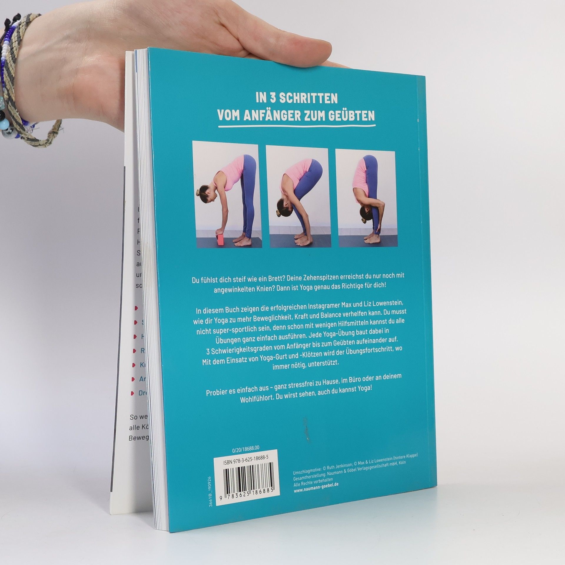 Jeder kann Yoga • Übung macht den Meister - Über 50 Übungen in jeweils 3 Schwierigkeitsgraden vom Anfänger zum Fortgeschrittenen • Weltweit erfolgreich auf Instagram @inflexibleyogis mit über 1 Million Followern • Einfache Schritt-für-Schritt-Anleitungen um jede Yoga-Übung richtig aufzubauen Yoga kann so einfach sein! Auf ihrem mega-erfolgreichen Instagram-Account @inflexibleyogis erreichen die beiden Yogalehrer Max Lowenstein und Liz Kong über 1 Million begeisterte Fans mit ihrer Message: Jeder kann Yoga! Sie müssen weder super-sportlich noch extrem beweglich sein, um Yoga zu praktizieren. In diesem Buch zeigen Max und Liz wie Sie mit wenigen Hilfsmitteln jede Yoga-Übung ganz einfach bewältigen können. Steigern Sie Ihre Kraft, Balance und Beweglichkeit in drei Schwierigkeitsgraden stressfrei zuhause, im Büro oder an Ihrem Wohlfühlort. Über 50 Übungen bieten einfache, klare Schritt-für-Schritt-Anleitungen, große, anschauliche Posen-Fotos und viele wertvolle Tipps zur richtigen Haltung und Ausführung. Die Einleitung erläutert die Grundlagen, die Hilfsmittel und die Grundposen in bebilderten und erklärten Steps, um Sie optimal in die Yoga-Praxis einzuführen. Scheuen Sie sich nicht davor, es auszuprobieren. Sie werden sehen, auch Sie können Yoga!