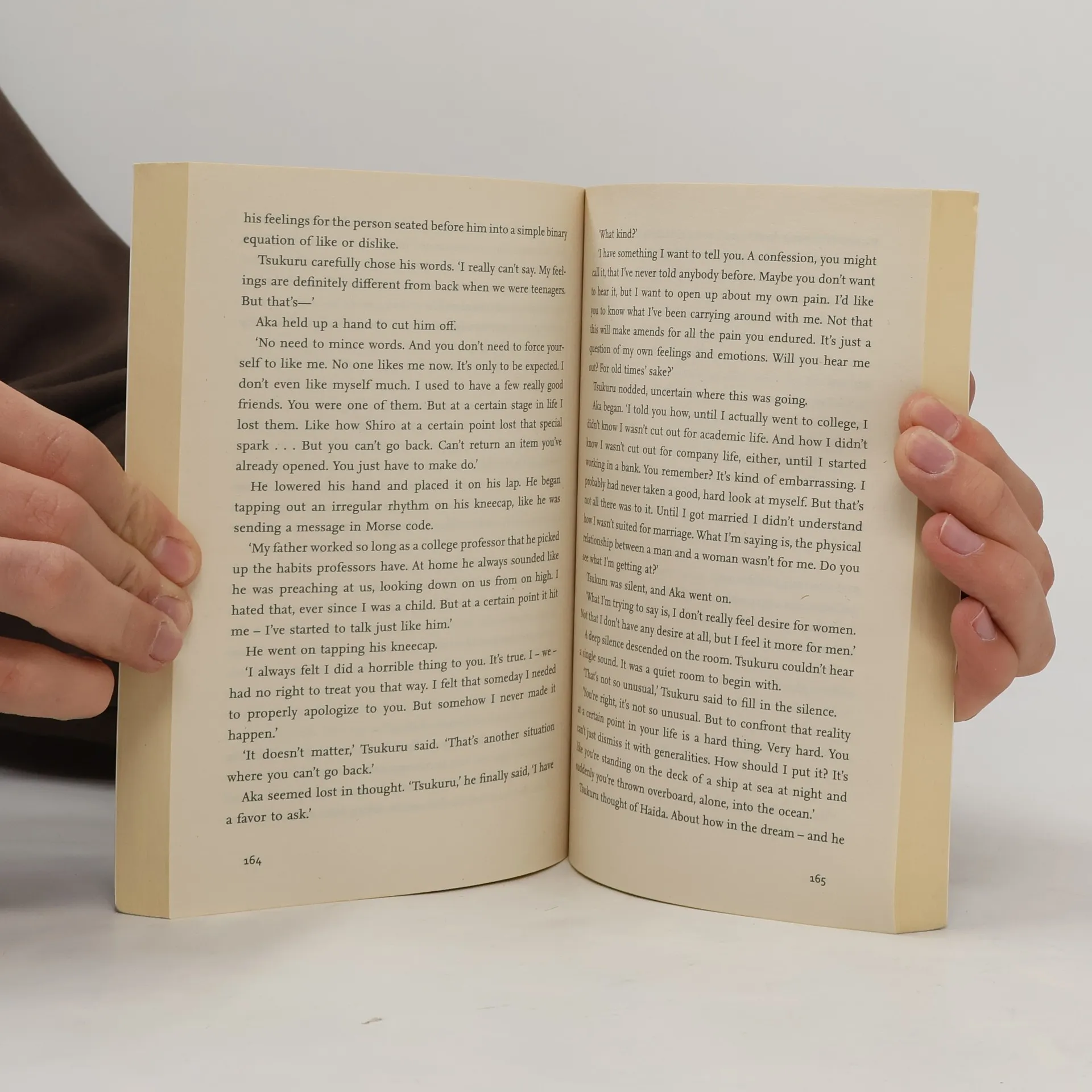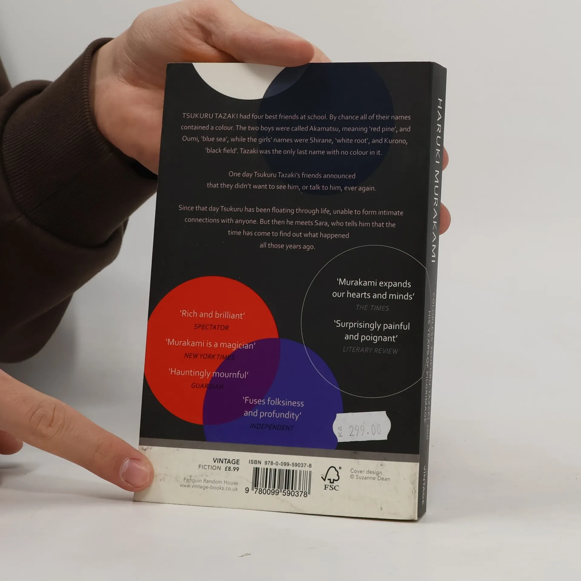 Tsukuru Tazaki had four best friends at school. By chance all of their names contained a colour. The two boys were called Akamatsu, meaning 'red pine', and Oumi, 'blue sea', while the girls' names were Shirane, 'white root', and Kurono, 'black field'. Tazaki was the only last name with no colour in it.