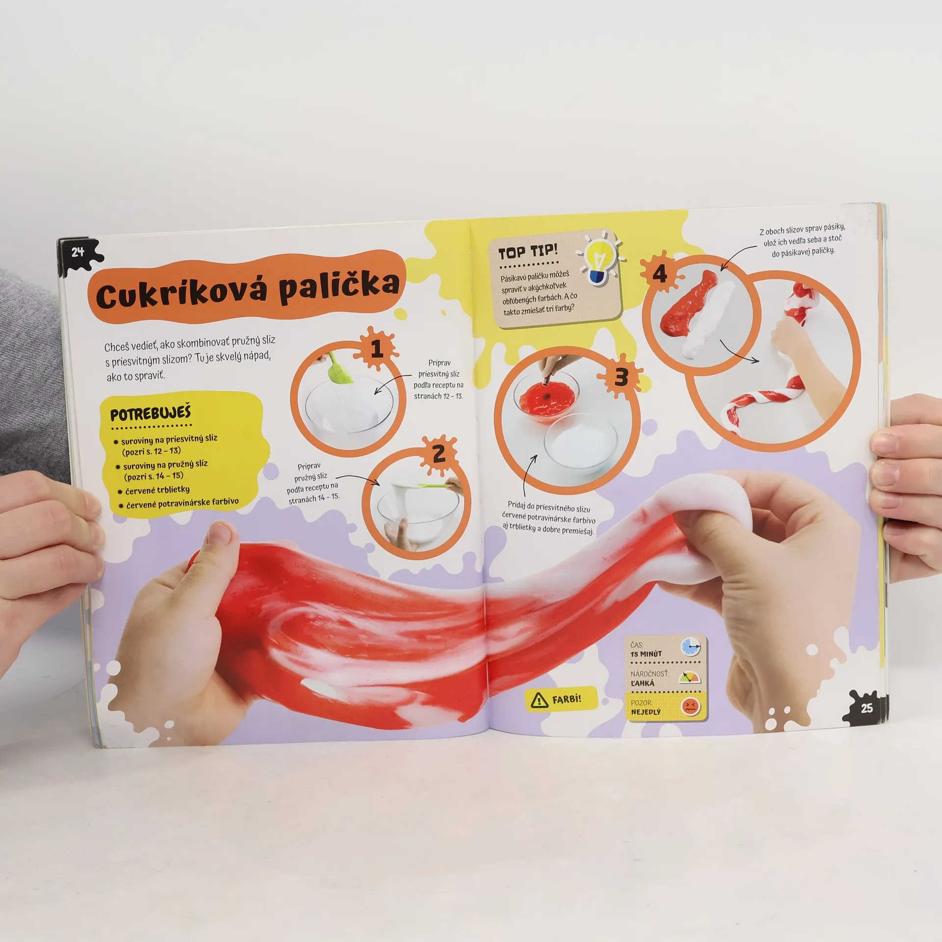 Kniha Super sliz obsahuje viac ako 30 úplne nových úžasných receptov, ktoré si môžete s rodičmi vyrobiť doma, navyše z bezpečných a ľahko dostupných surovín. Pri výrobe vám pomôžu jednoduché postupy a fotografie. Tak šup! Pustite sa do prípravy maslového, vajcového, zmrzlinového alebo kečupového slizu! Navyše v knihe nájdete aj recepty na narodeninový, jarný, voňavý, halloweensky sliz či sliz meniaci farbu.