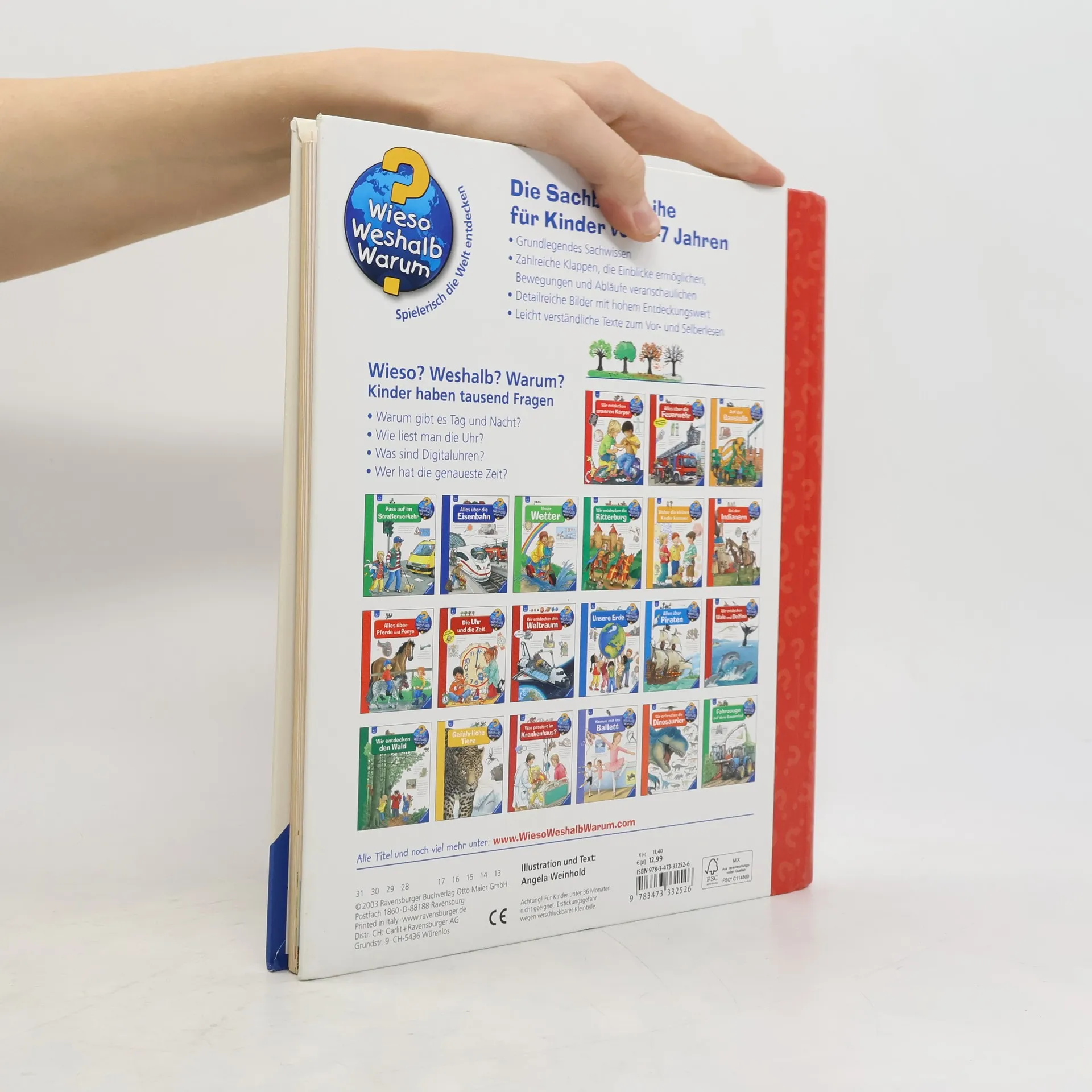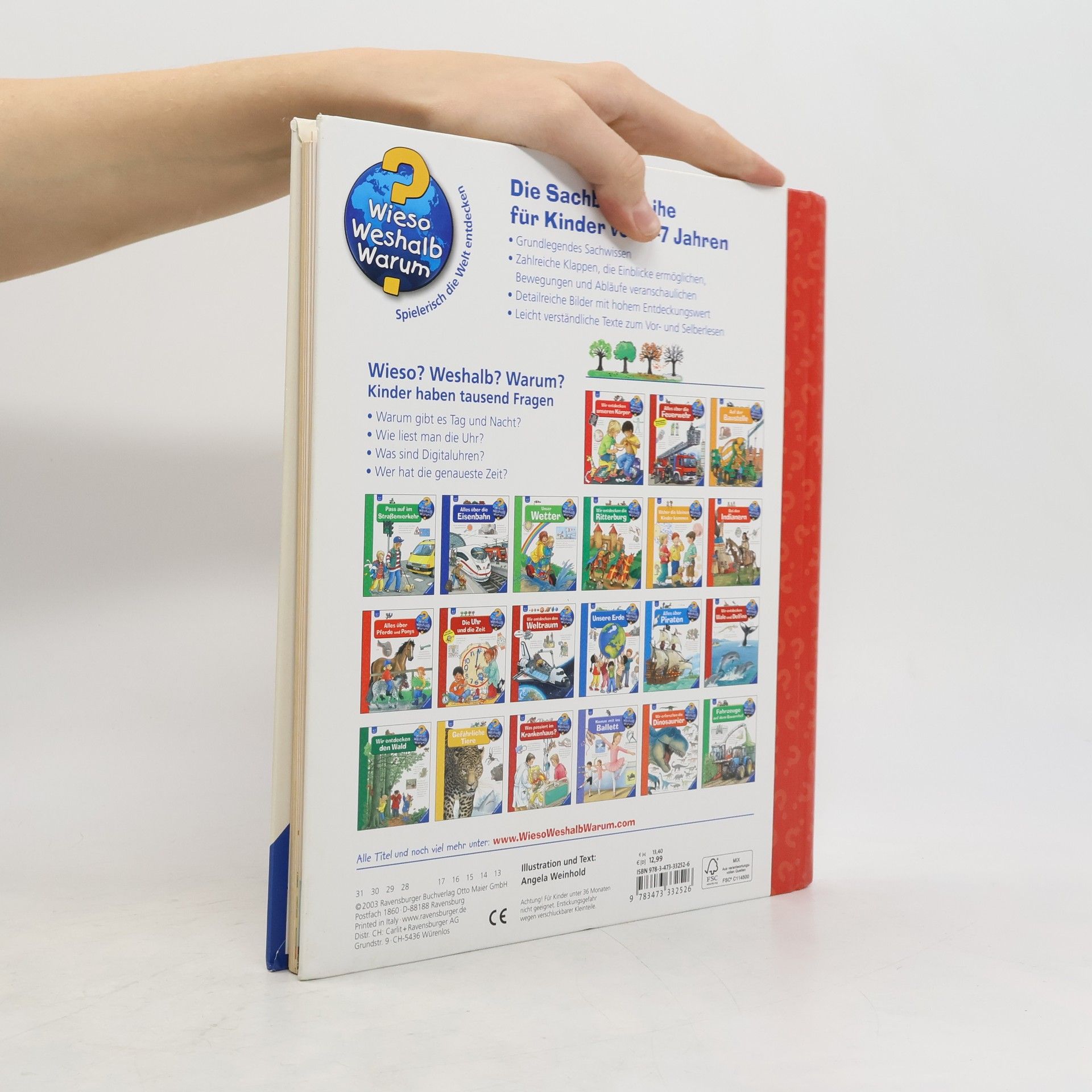Warum muss man sich eigentlich ständig beeilen und pünktlich im Kindergarten oder bei der Arbeit sein? Mit diesem Buch lernen Kinder das Phänomen Zeit anhand leicht verständlicher Einteilungen wie Tages- und Jahreszeiten kennen. Auch Zeiteinheiten wie Minute, Tag und Jahr werden anschaulich erläutert. Mithilfe der im Buch befestigten Übungsuhr können die Kinder Schritt für Schritt selbst ausprobieren, wie man Uhrzeiten bestimmt. Wieso? Weshalb? Warum? Die Sachbuchreihe für Kinder von 4–7 Jahren Jeden Tag entdecken Kinder etwas Neues – da kommen viele Fragen auf. Warum sind die Dinosaurier ausgestorben? Wo ist die Sonne in der Nacht? Wozu brauchen wir das Blut? Die beliebte Sachbuchreihe Wieso? Weshalb? Warum? gibt Kindern Antworten auf Augenhöhe. Dabei werden die unterschiedlichsten Themen aus der Alltags- und Interessenswelt der Kinder altersgerecht und mit viel Liebe zum Detail unter die Lupe genommen. Detailreiche Bilder, verständliche Sachtexte und überraschende Klappen, die Bewegungen oder Abläufe veranschaulichen und hinter die Dinge blicken lassen, ermöglichen Kindern, sich ihre Themen selbst zu erschließen. Der Spaß am eigenhändigen Entdecken, die liebevolle Umsetzung und die qualitativ hochwertige Ausstattung garantieren langanhaltende Freude an jedem einzelnen Buch.