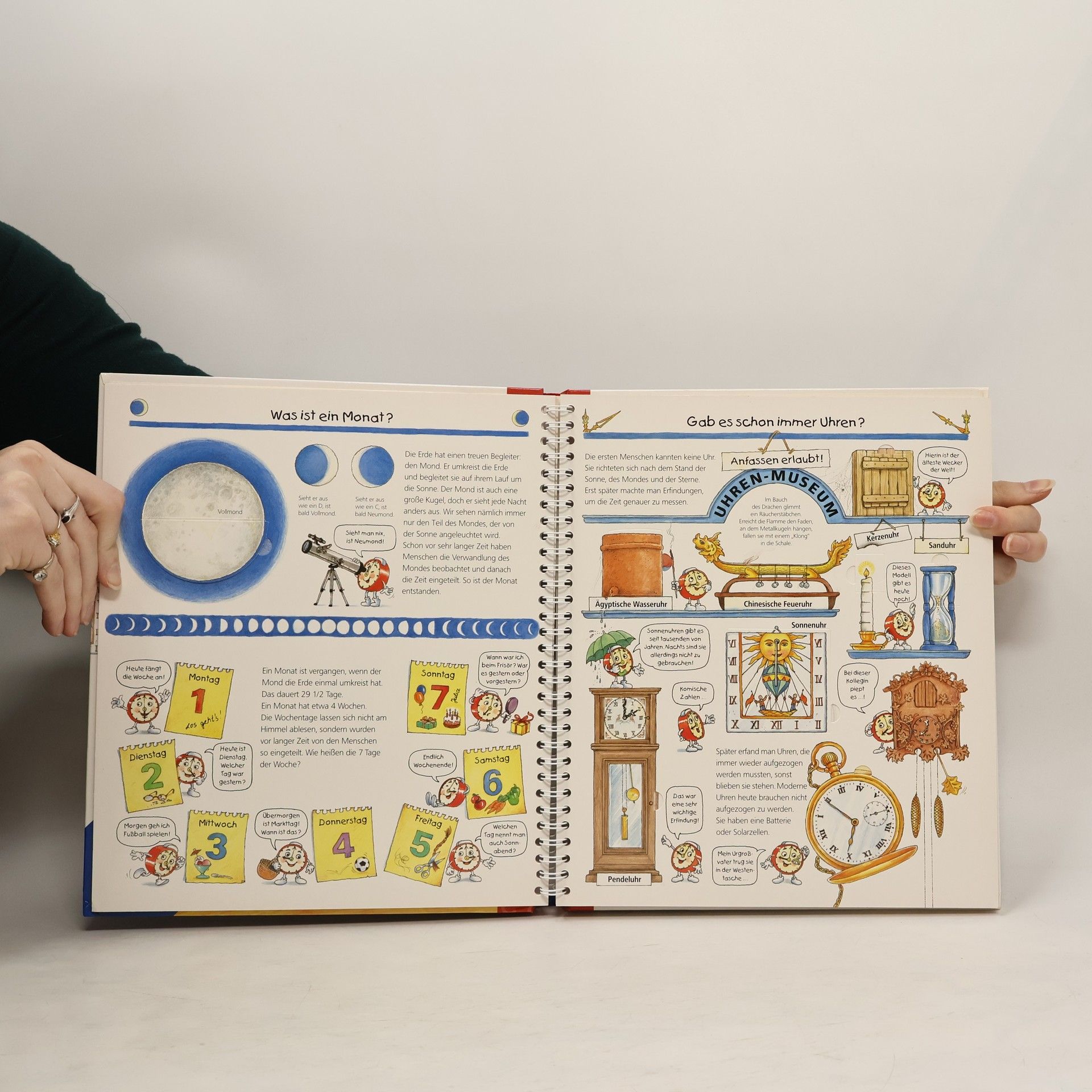 Warum muss man sich eigentlich ständig beeilen und pünktlich im Kindergarten oder bei der Arbeit sein? Mit diesem Buch lernen Kinder das Phänomen Zeit anhand leicht verständlicher Einteilungen wie Tages- und Jahreszeiten kennen. Auch Zeiteinheiten wie Minute, Tag und Jahr werden anschaulich erläutert. Mithilfe der im Buch befestigten Übungsuhr können die Kinder Schritt für Schritt selbst ausprobieren, wie man Uhrzeiten bestimmt. Wieso? Weshalb? Warum? Die Sachbuchreihe für Kinder von 4–7 Jahren Jeden Tag entdecken Kinder etwas Neues – da kommen viele Fragen auf. Warum sind die Dinosaurier ausgestorben? Wo ist die Sonne in der Nacht? Wozu brauchen wir das Blut? Die beliebte Sachbuchreihe Wieso? Weshalb? Warum? gibt Kindern Antworten auf Augenhöhe. Dabei werden die unterschiedlichsten Themen aus der Alltags- und Interessenswelt der Kinder altersgerecht und mit viel Liebe zum Detail unter die Lupe genommen. Detailreiche Bilder, verständliche Sachtexte und überraschende Klappen, die Bewegungen oder Abläufe veranschaulichen und hinter die Dinge blicken lassen, ermöglichen Kindern, sich ihre Themen selbst zu erschließen. Der Spaß am eigenhändigen Entdecken, die liebevolle Umsetzung und die qualitativ hochwertige Ausstattung garantieren langanhaltende Freude an jedem einzelnen Buch.
