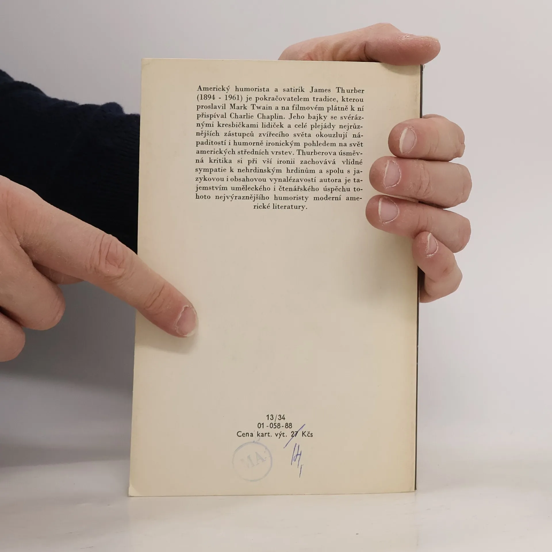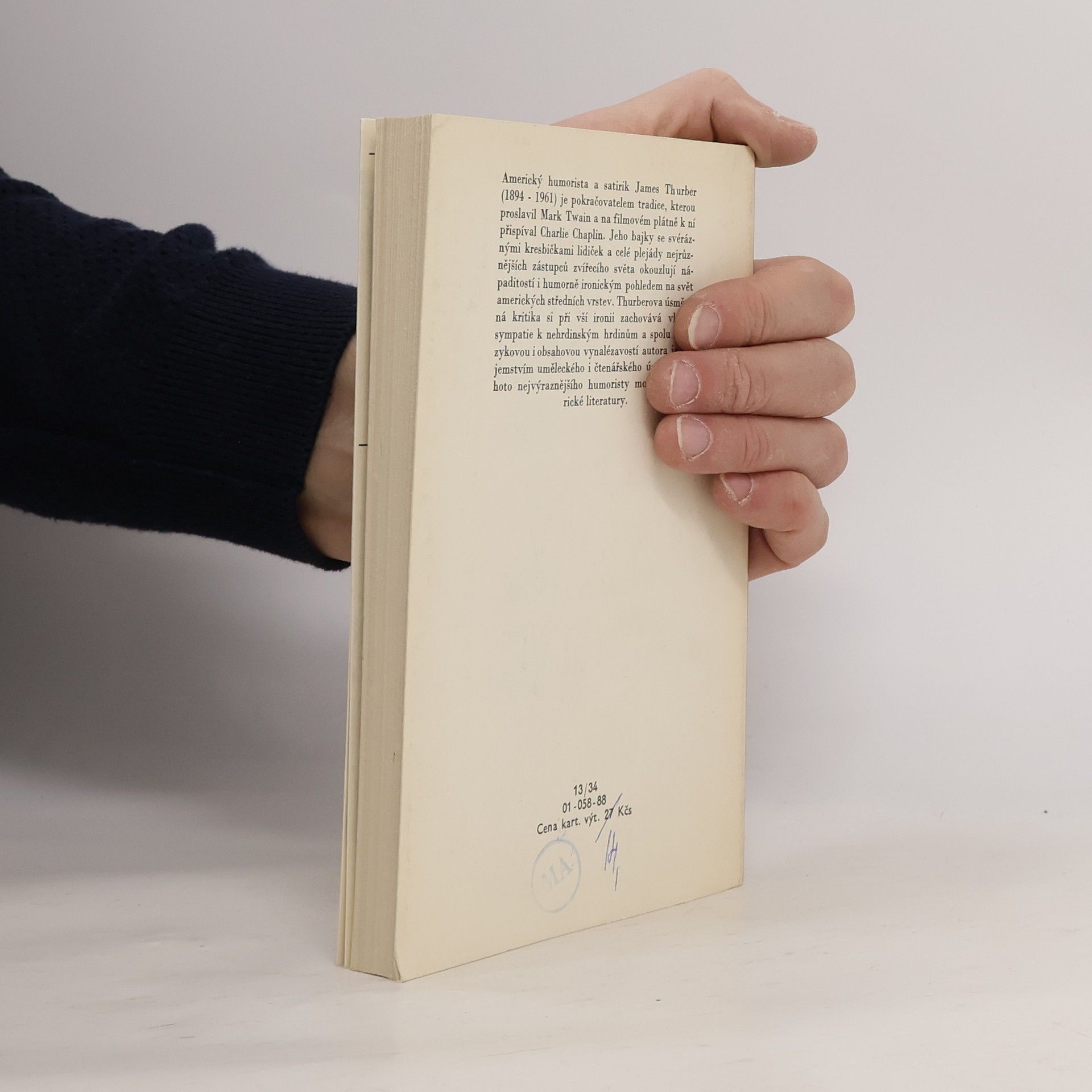 Americký humorista a satirik James Thurber (1894 — 1961) je pokračovatelem tradice, kterou proslavil Mark Twain a na filmovém plátně k ní přispíval Charlie Chaplin. Jeho bajky se svéráznými kresbičkami lidiček a celé plejády nejrůznějších zástupců zvířecího světa okouzlují nápaditostíi humorně ironickým pohledem na svět amerických středních vrstev. Thurberova úsměvná kritika si při vší ironii zachovává vlídné sympatie k nehrdinským hrdinům a spolu s jazykovou i obsahovou vynalézavostí autora je tajemstvím uměleckého i čtenářského úspěchu tohoto nejvýraznějšího humoristy moderní americké literatury.