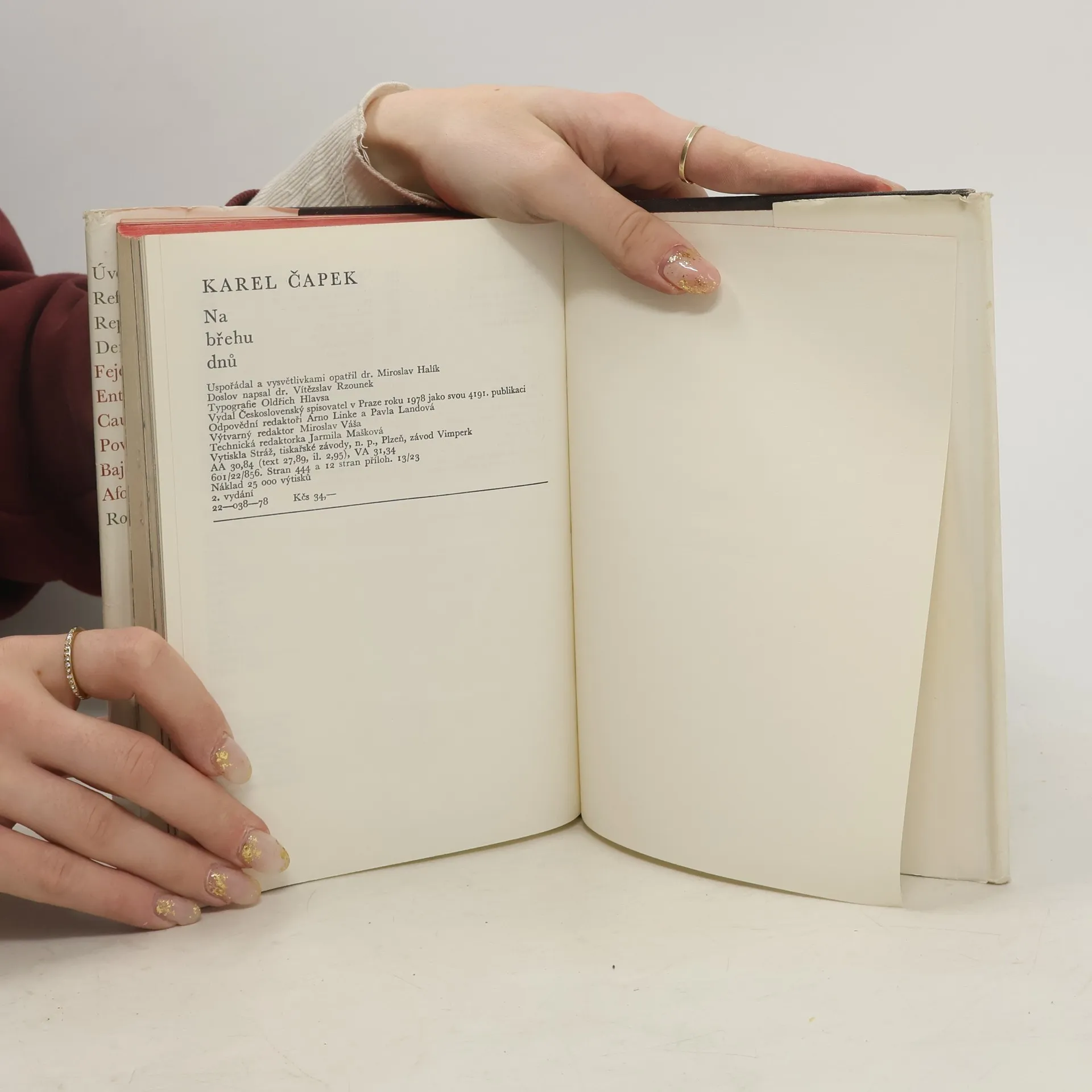 Výběr časopiseckých prací od r. 1917-1938 a článek napsaný v poslední den autorova života. Největší část výboru zabírají fejetony a sloupky, kde je Čapkův výraz nejosobitější. Jde o práce, týkající se nejrůznějších oblastí veřejného, politického i kulturního života. Úvodníky, referáty, reportáže, denní zprávy, povídky, bajky, aforismy, rozhlásky... 2. vydání.
