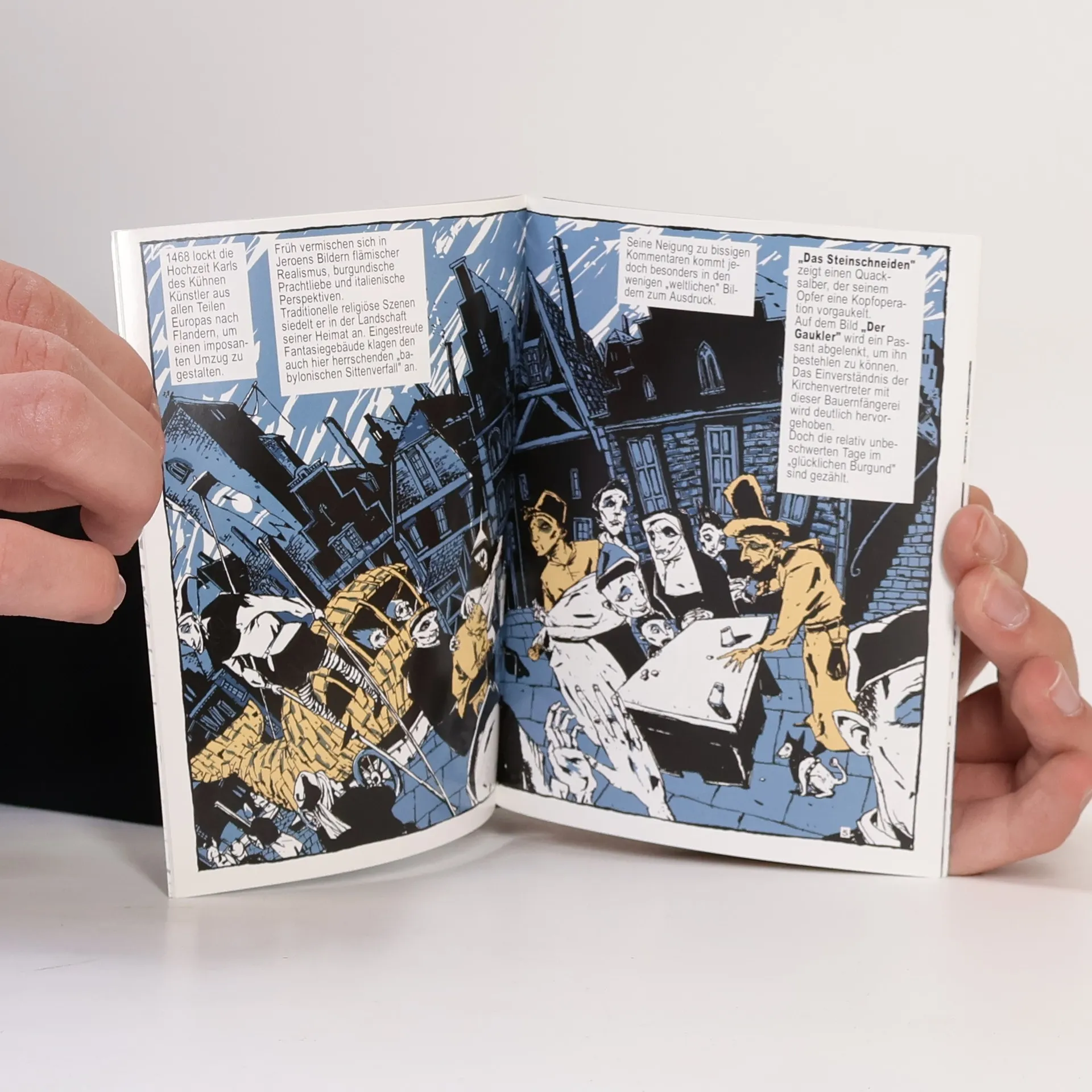 Die Lebensspanne des Hieronymus Bosch (1450-1516) fällt in die letzte Phase jener Epoche, die spätere Generationen als Finsteres Mittelalter bezeichnen. Mit weniger als 30 Bildern erweist sich Bosch als virtuoser Chronist eines zu Ende gehenden Zeitalters. Seine frivolen Höllenbilder sichern ihm die Aufmerksamkeit bis in die heutige Zeit. Die wenigen überlieferten Daten zum Maler kombiniert diese Comic-Biographie mit aufschlussreichen Informationen zur Umgebung des geheimnisvollen Künstlers und des mittelalterlichen Lebens.