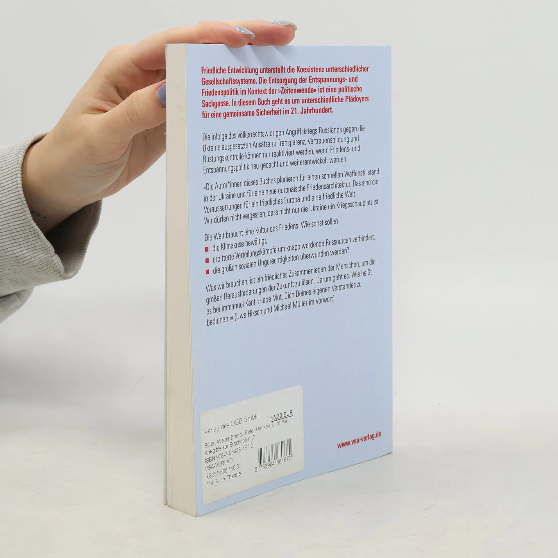 Die Alternative zur politisch-militärischen Blockbildung heißt: Neubegründung der Entspannungspolitik. Nur bei Gewährleistung gemeinsamer Sicherheit können die globalen Probleme des Klimawandels und der ökologischen Transformation bewältigt werden. Die mit der »Zeitenwende« auf den Weg gebrachte Aufrüstung steht dem entgegen.Nicht nur die politischen Systeme der postsowjetischen Gesellschaften des Ostens (Russland, Belarus, Kasachstan u.a.) sind eine Herausforderung für den Westen, auch die rasante wirtschaftliche Entwicklung der Volksrepublik China ist eine Herausforderung für westliche liberal-kapitalistische Ideologien und Machtansprüche.In der sich herausbildenden neuen Weltordnung beinhalten Abgrenzungen, Konfrontationen und Sanktionen die Gefahr einer Blockade von Nationen übergreifenden Handlungs- und Lösungsansätzen. Die infolge des Angriffskrieg Russlands gegen die Ukraine ausgesetzten Ansätze zu Transparenz, Vertrauensbildung und Rüstungskontrolle können jedoch nur reaktiviert werden, wenn Friedens- und Entspannungspolitik im 21. Jahrhundert neu gedacht und weiterentwickelt werden.
