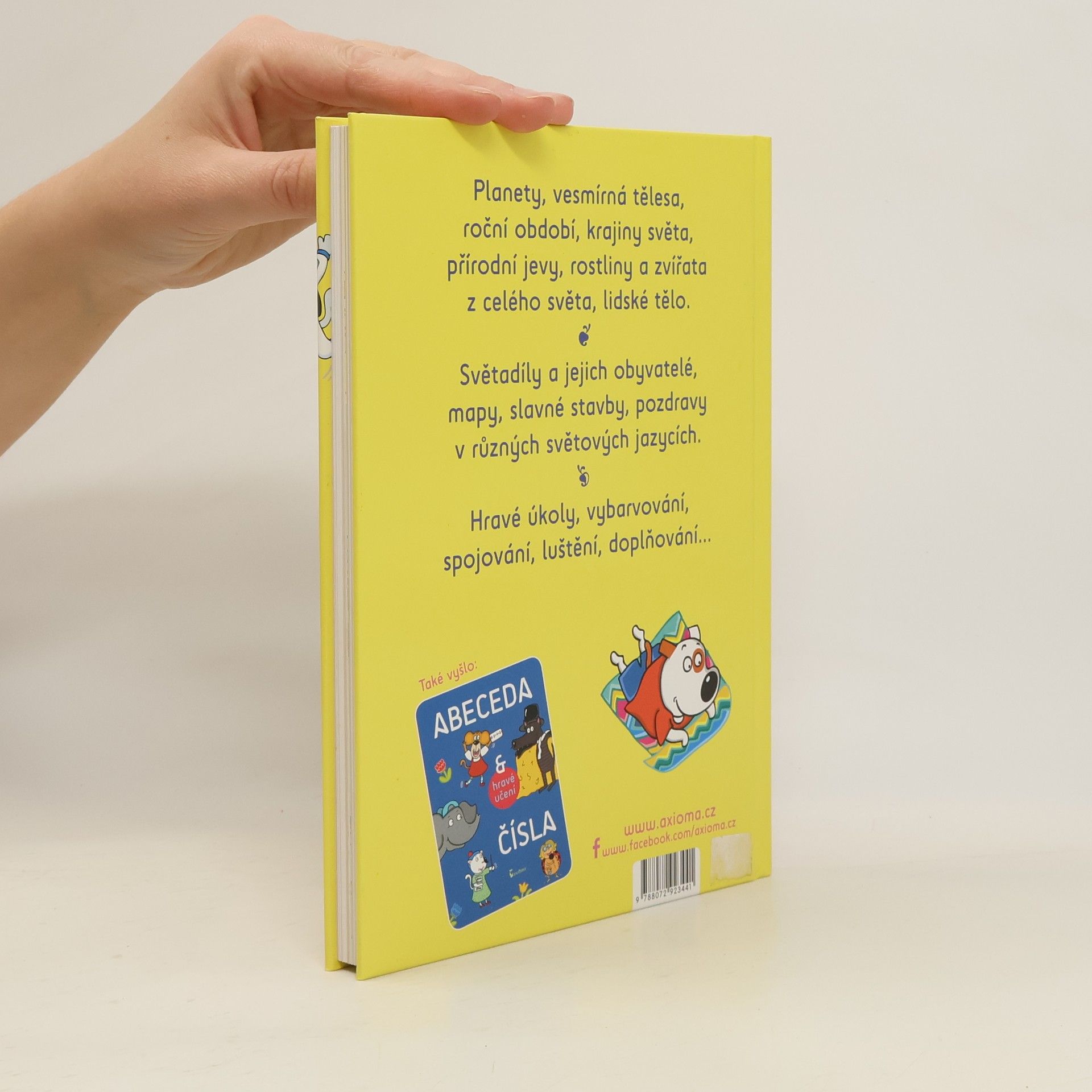 Planety, vesmírná tělesa, roční období, krajiny světy, přírodní jevy, rostliny a zvířata z celého světa, lidské tělo. Světadíly a jejich obyvatelé, mapy, slavné stavby, pozdravy v různých světových jazycích. Hravé úkoly, vybarvování, spojování, luštění, doplňování...