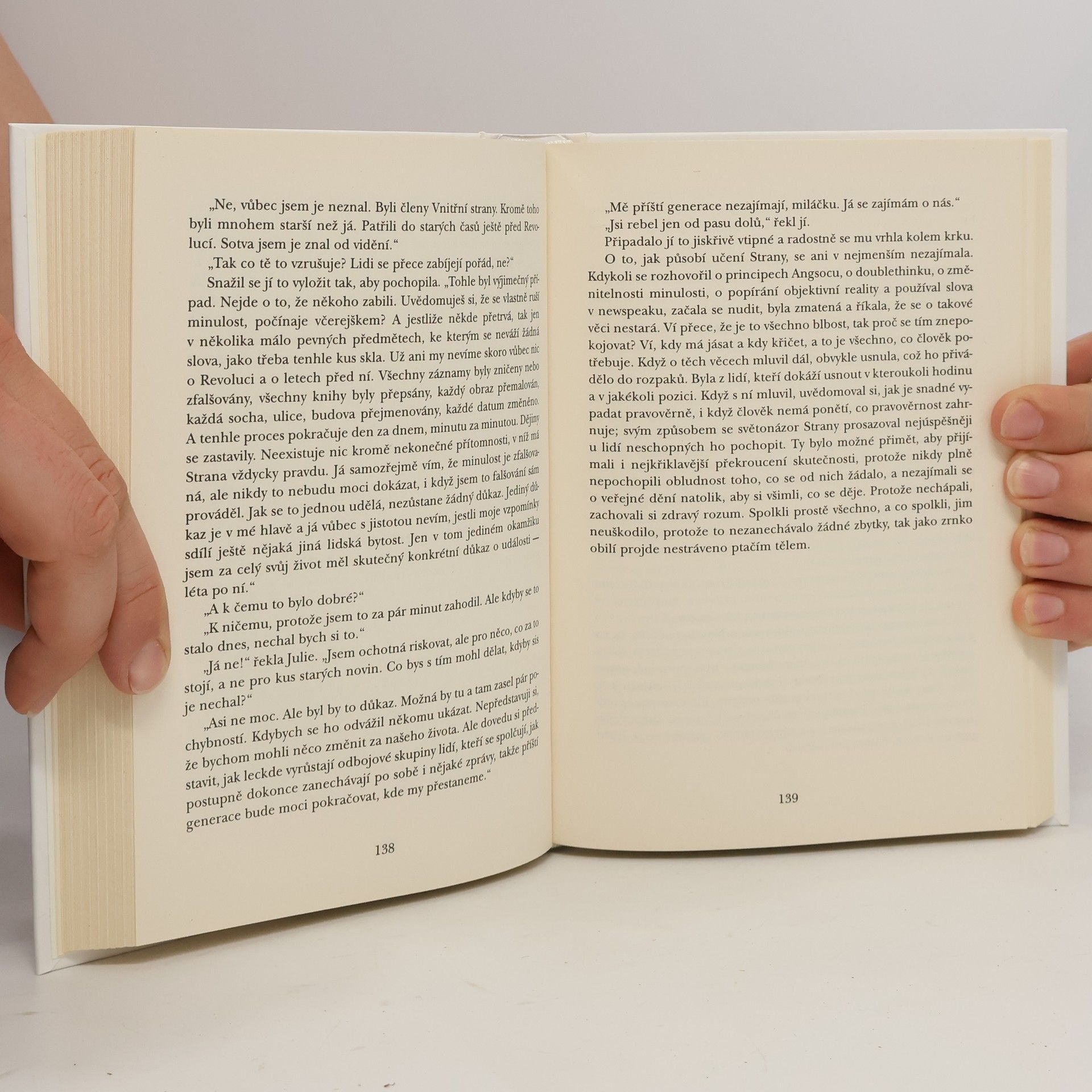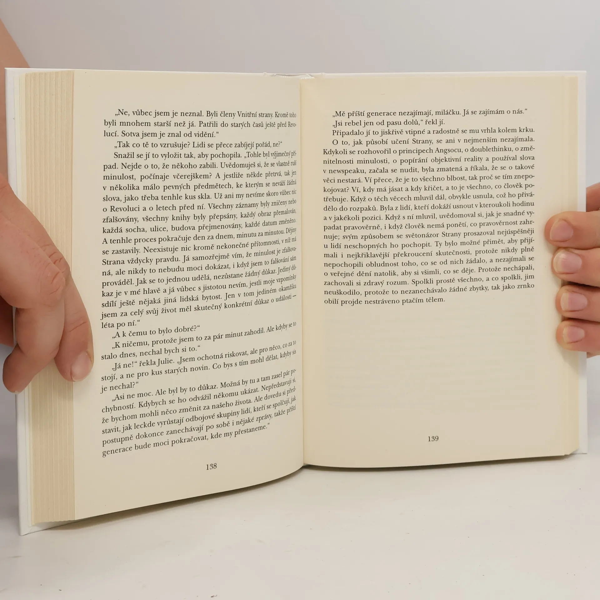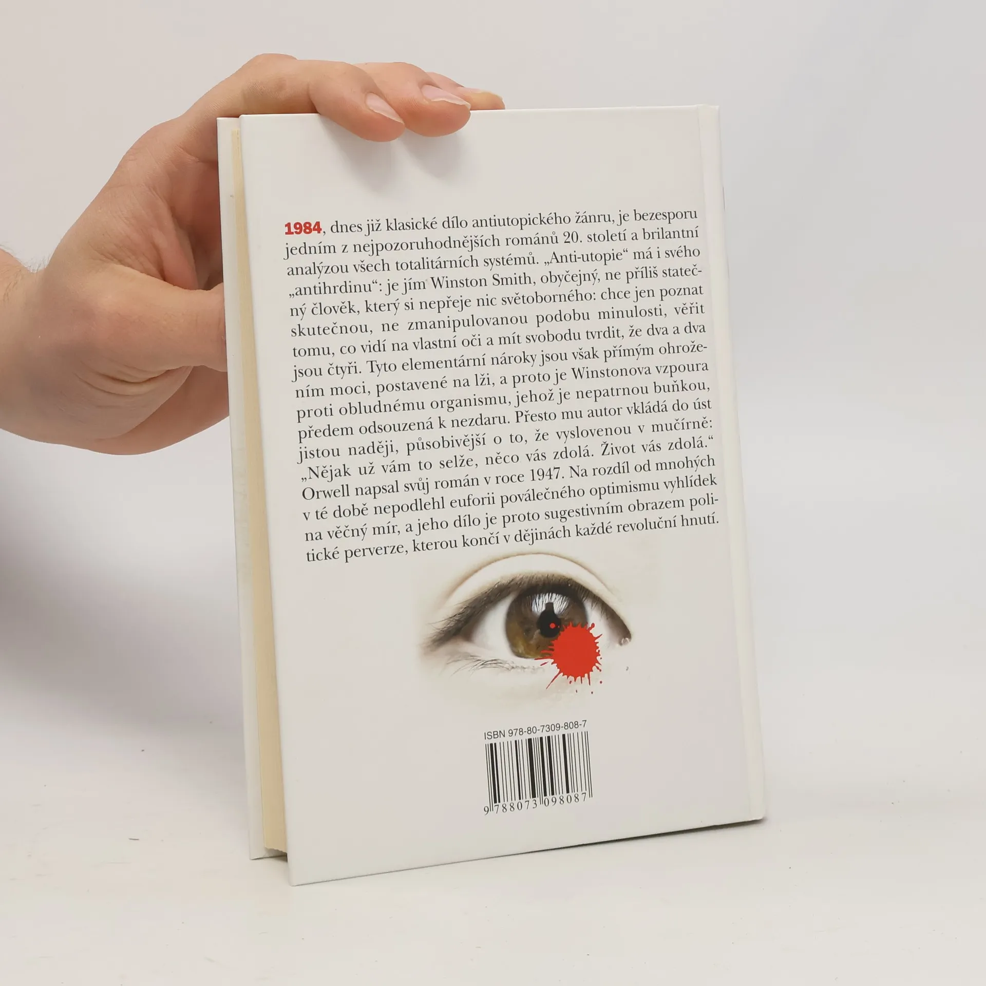 Winston Smith žije v Oceánii, jedné ze tří velmocí, které existují v Orwellově antiutopickém světě. V této zemi vládne svou neomezenou mocí Strana, v jejímž čele stojí (snad) imaginární postava Velkého bratra. Velký bratr tě sleduje! Heslo, které občané Oceánie spatřují mnohokrát denně na plakátech s údajnou podobiznou Velkého bratra v nadživotní velikosti. Ve Winstonově bytě, stejně jako v bytech ostatních členů Strany a na veřejných prostranstvích, jsou umístěny obrazovky, které nepřetržitě sledují veškeré dění ve svém dosahu. Záznamy obrazovek sledují příslušníci Ideopolicie, kteří se snaží odhalit jakýkoliv zločin proti Straně (ideozločin). Jedinými občany, kteří nejsou tak důsledně sledování, zůstávájí dělníci – proléti. Jejich životní podmínky jsou ale tak bídné, že opravdu nemají myšlenky na nějaký ideozločin. Navíc jsou dokonale ovládáni stranickou propagandou a slepě věří smyšleným úspěchům, které se dozví z obrazovky.
