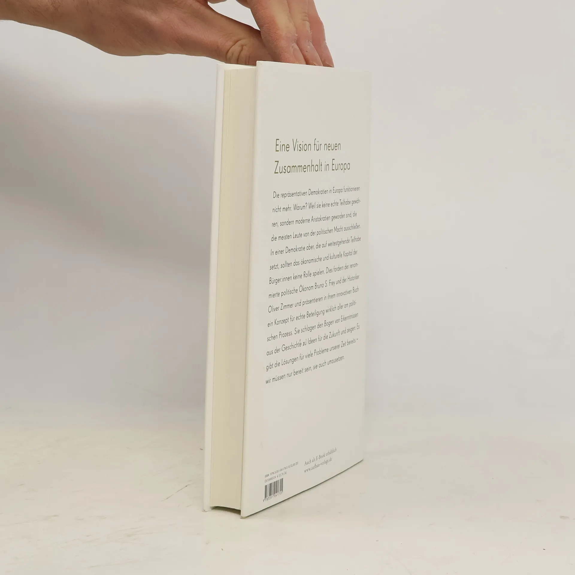 Eine Vision für neuen Zusammenhalt in Europa Die repräsentativen Demokratien in Europa funktionieren nicht mehr. Warum? Weil sie keine echte Teilhabe gewähren, sondern moderne Aristokratien geworden sind, die die meisten Leute von der politischen Macht ausschließen. In einer Demokratie aber, die auf weitestgehende Teilhabe setzt, sollten das ökonomische und kulturelle Kapital der Bürger: innen keine Rolle spielen. Dies fordern der renommierte politische Ökonom Bruno S. Frey und der Historiker Oliver Zimmer und präsentieren in ihrem innovativen Buch ein Konzept für echte Beteiligung wirklich aller am politischen Prozess. Sie schlagen den Bogen von Erkenntnissen aus der Geschichte zu Ideen für die Zukunft und zeigen: Es gibt die Lösungen für viele Probleme unserer Zeit bereits – wir müssen nur bereit sein, sie auch umzusetzen.