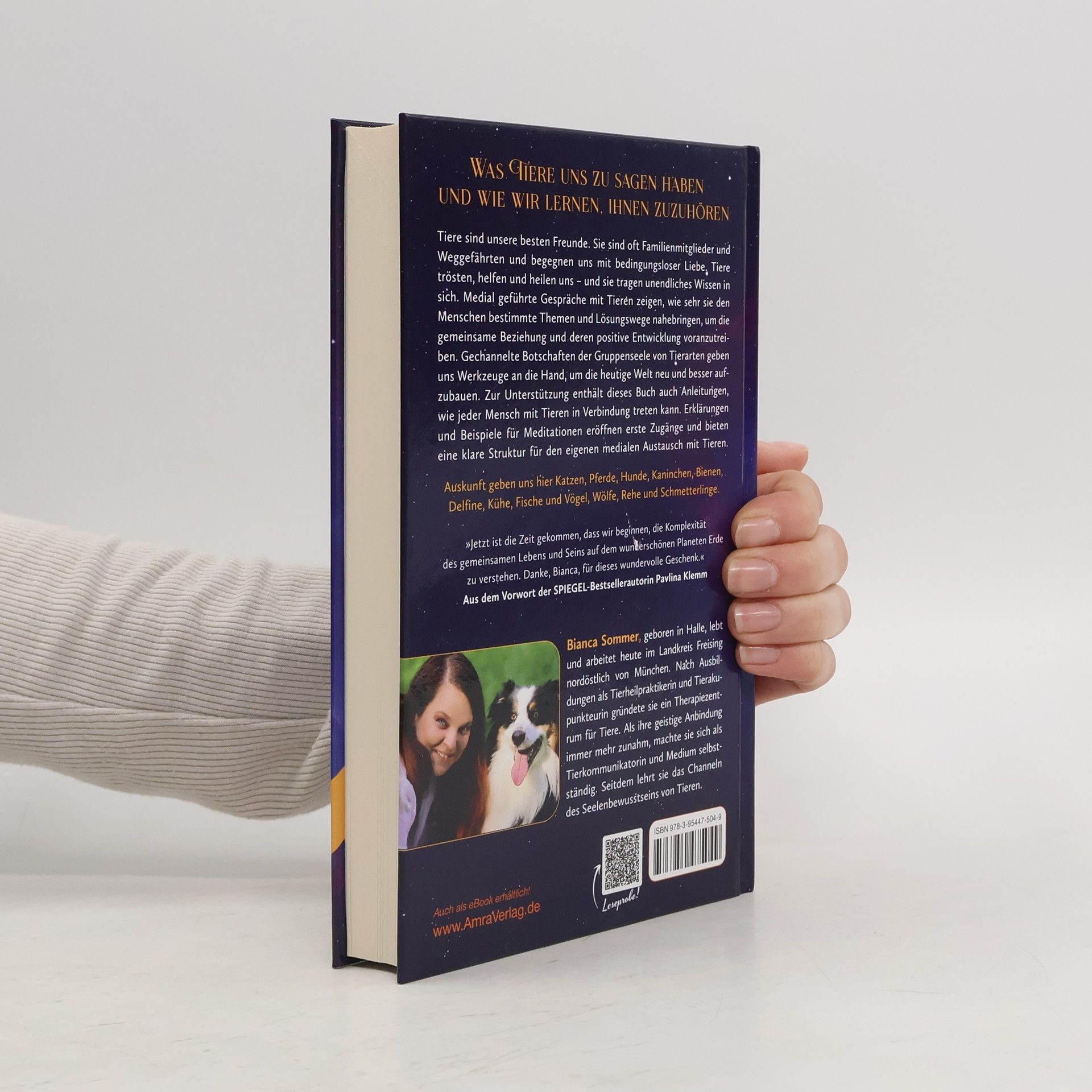Tiere sind unsere besten Freunde und oft Familienmitglieder, die uns mit bedingungsloser Liebe begegnen. Sie trösten und heilen uns und tragen unendliches Wissen in sich. Medial geführte Gespräche mit Tieren zeigen, wie sie uns bestimmte Themen und Lösungswege näherbringen, um unsere Beziehung zu ihnen positiv zu entwickeln. Gechannelte Botschaften von Tierarten bieten Werkzeuge, um die Welt neu und besser zu gestalten. Das Buch enthält Anleitungen, wie jeder Mensch mit Tieren in Verbindung treten kann. Meditationen eröffnen Zugänge und bieten eine klare Struktur für den medialen Austausch mit Tieren. Hierzu geben Katzen, Pferde, Hunde, Kaninchen, Bienen, Delfine, Kühe, Fische, Vögel, Wölfe, Rehe und Schmetterlinge Auskunft. Im Vorwort der SPIEGEL-Bestsellerautorin Pavlina Klemm wird betont, dass es an der Zeit ist, die Komplexität des gemeinsamen Lebens auf der Erde zu verstehen. Bianca Sommer, die in Halle geboren wurde und heute im Landkreis Freising lebt, hat als Tierheilpraktikerin und Tierakupunkteurin ein Therapiezentrum gegründet. Durch ihre zunehmende geistige Anbindung arbeitet sie als Tierkommunikatorin und Medium und lehrt das Channeln des Seelenbewusstseins von Tieren.